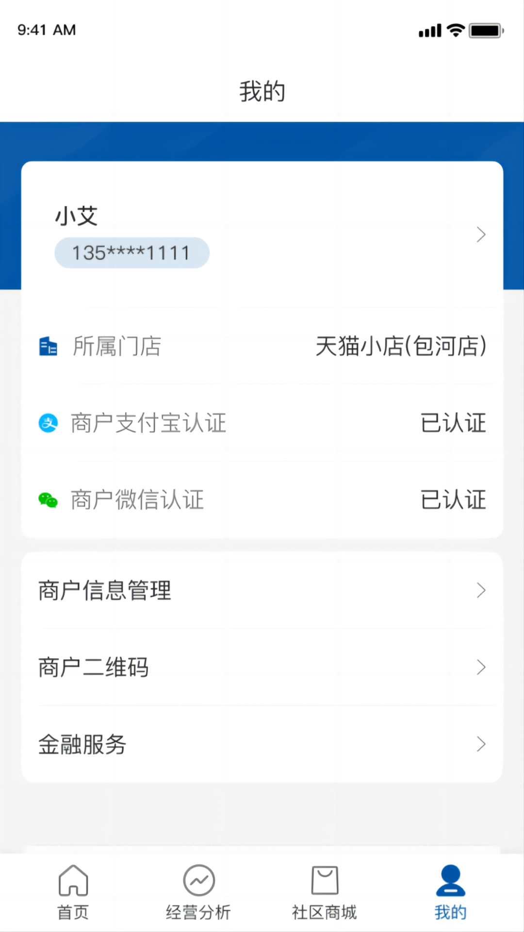 【我的】支持用户查询商户信息、个人信息、商家认证状态、修改登录认证方式等功能。
