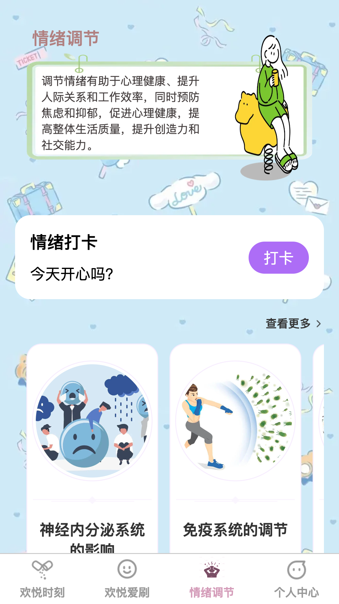 【情绪调节】情绪调节模块包含情绪的影响小知识和情绪打卡。每日情绪打卡记录您的心情变化,帮助您逐渐形成积极乐观的生活态度。