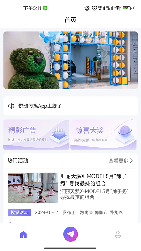 悦动传媒有海量广告和精彩活动,而且全部免费哦。在这里,你能够发布投票活动,为自己心仪的选手拉票。同时,还可以观看海量广告以获取投票券,这些投票券能用于兑换票券,进而投票给自己喜爱的选手呢。