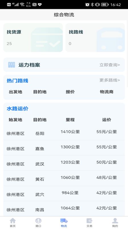 在【综合物流】方面,提供货源、运力、运力档案、水路运价等在线信息的查看服务。