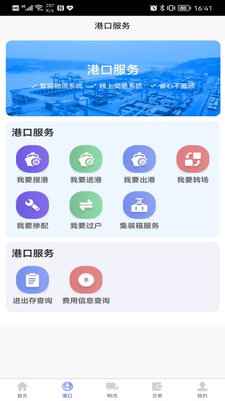 在【港口服务】方面,能够为用户提供报港、进港、出港、转场、掺配、过户、集装箱等业务的在线办理服务,同时支持费用查询和进出存查询。