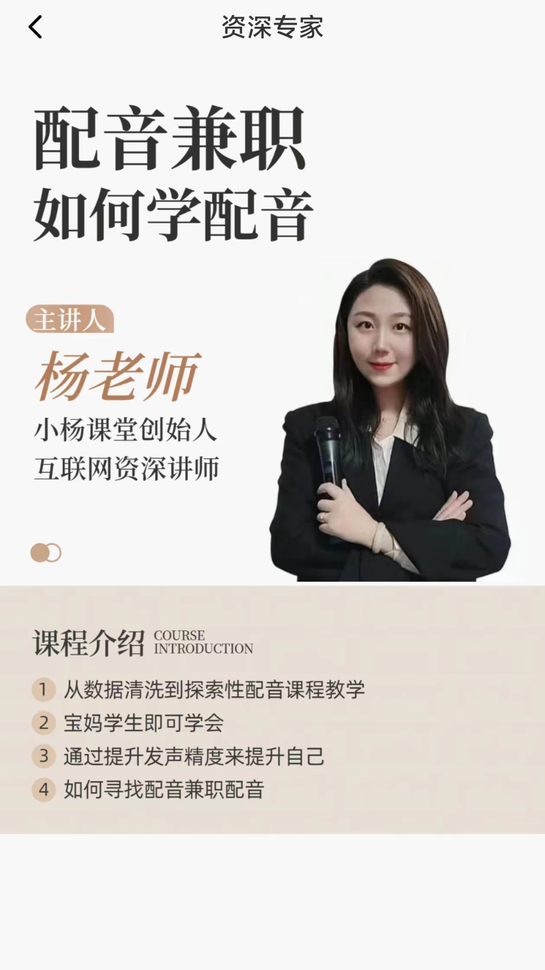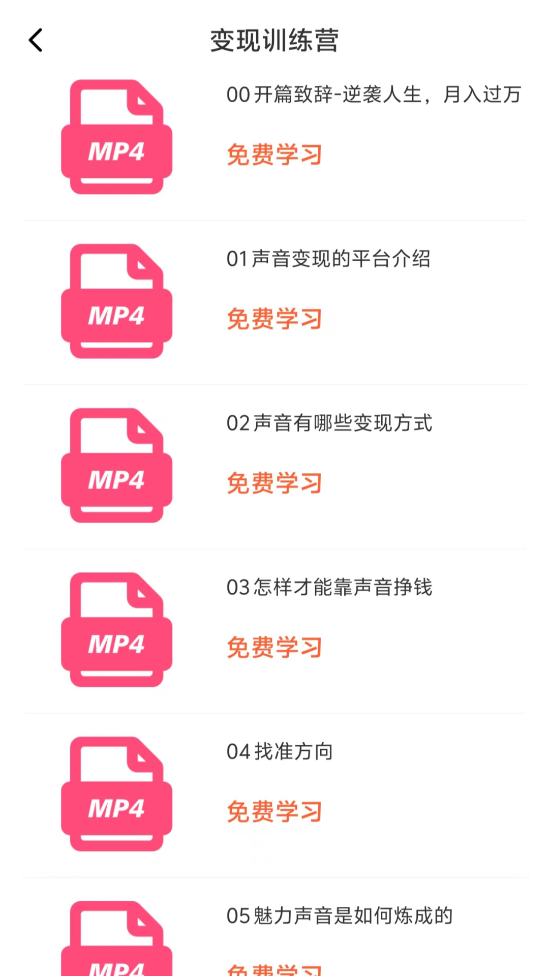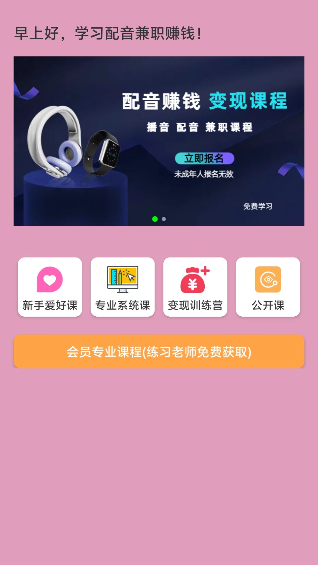 配音赚钱是一款APP,它能免费教大家怎样正确学习配音技能从而赚钱。该APP设有小白课程、专业系统课程、变现训练课程以及公开课程,这些课程均可免费获取。这款APP很适合宝妈、学生这类拥有充足时间的人群前来学习。在掌握配音技能之后,就能够寻找相关兼职来赚钱,同时还能提升自己的专业技能水平。