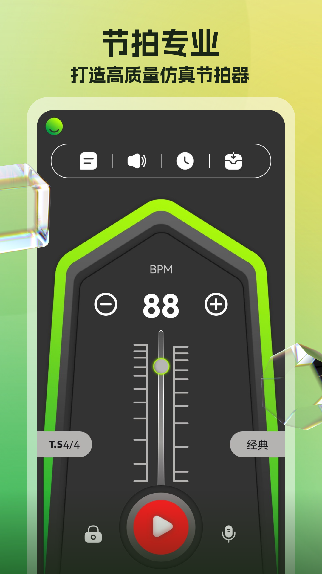 这是一款功能多样、操作简便的专业节拍器APP,可适配多种乐器。它是专为热爱乐器节奏的您打造的专业节拍器与调音器。它不但有助于您开展日常的乐器节奏练习,而且可以作为乐器高阶训练的必备工具。节拍器让节奏律动的把握变得轻松便捷,您随时随地都能使用,那种美妙的感觉难以言表,从此让您爱上古筝、吉他、钢琴、尤克里里、小提琴等乐器的节奏。快来使用这个免费的节拍器,让乐器学习更加快乐、轻松!