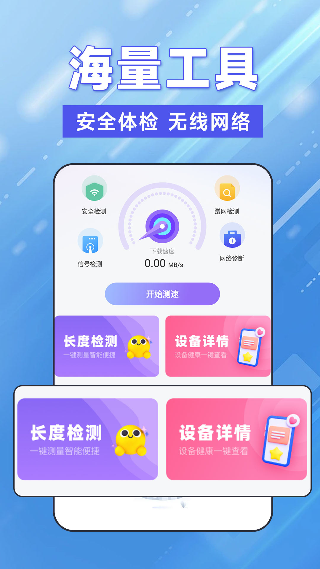 1、一键测速:查看手机网速,2G、3G、4G、5G、Wifi都可使用;