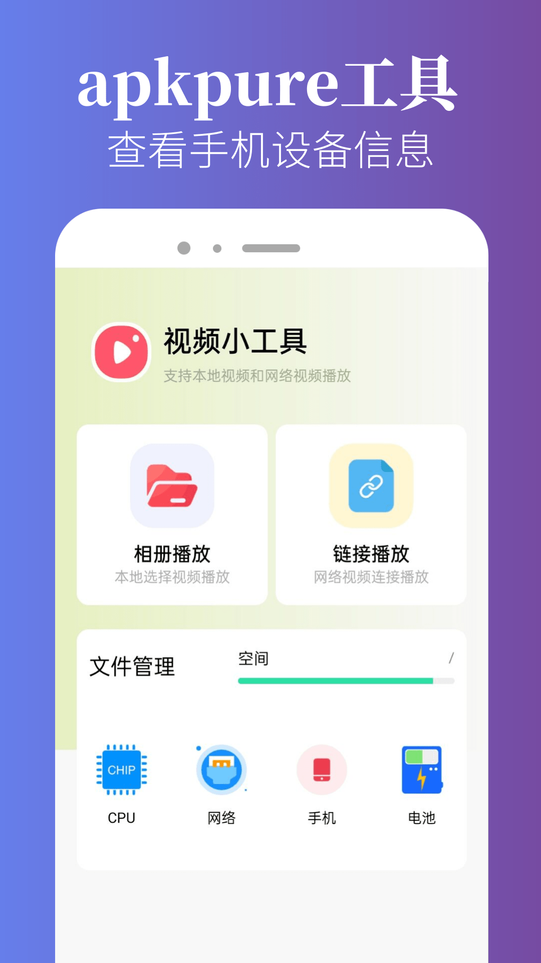 其【本机小工具】涵盖了视频播放器、手机设备信息查看(如手机型号等)、CPU信息查看、网络信息查看以及电池信息查看等功能。
