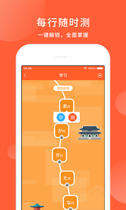 可以对五十音图的每行随时进行测试,只需一键就能解锁下一行,循序渐进地掌握104个音。而且还有阶段测试,能够检测日语学习的成果。