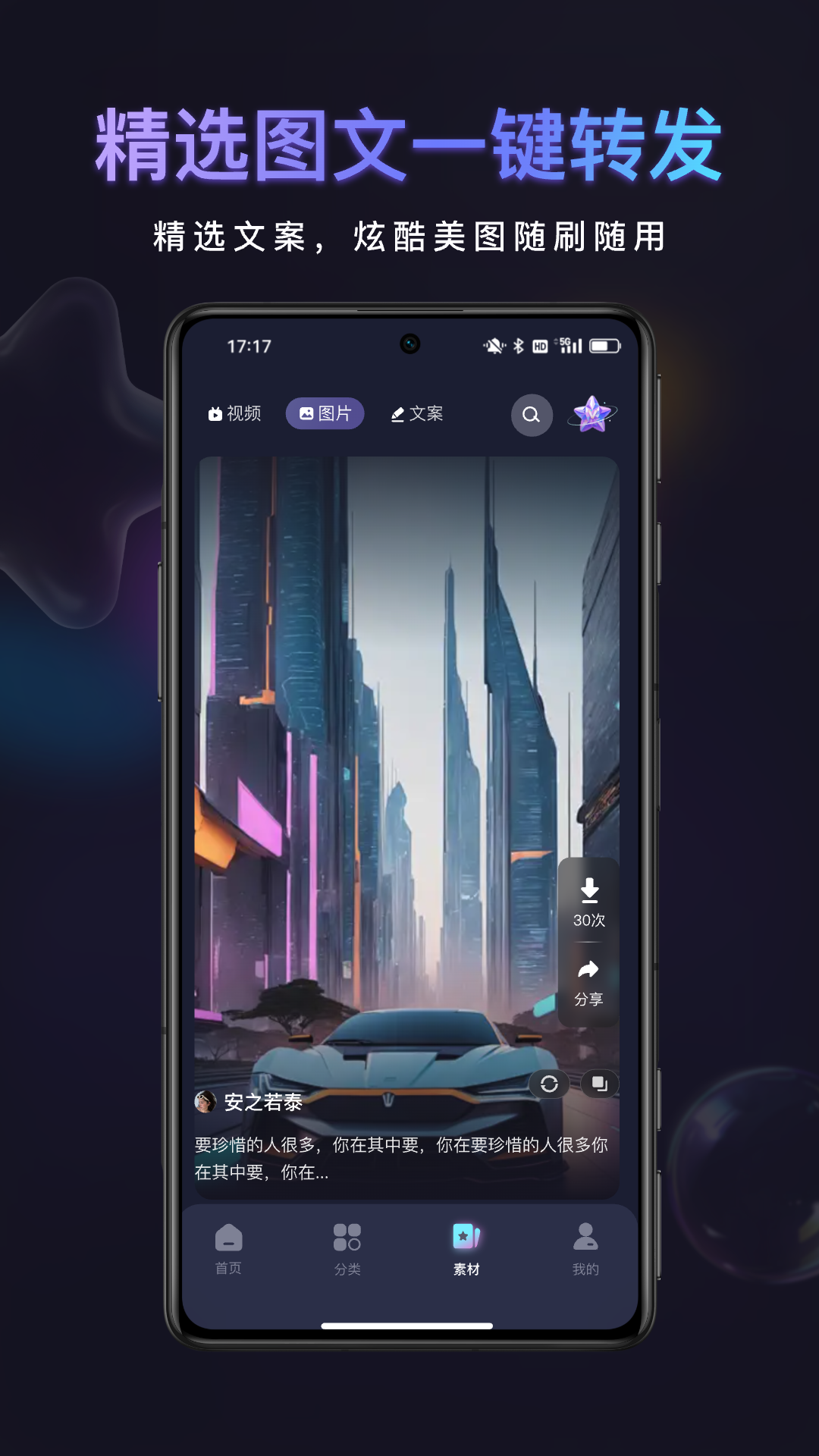 友圈共赏是一款专为多媒体动态内容创作者打造的免费提供素材资源的软件。创作者们能够在这个软件中轻松运用素材创作出精彩的短视频。这里的素材资源相当丰富,其中有众多豪车、酒吧相关的视频素材,还有海量的文案以及精美图片可供选择。此外,软件具备视频编辑功能,使用户可以便捷地进行创作与编辑工作。