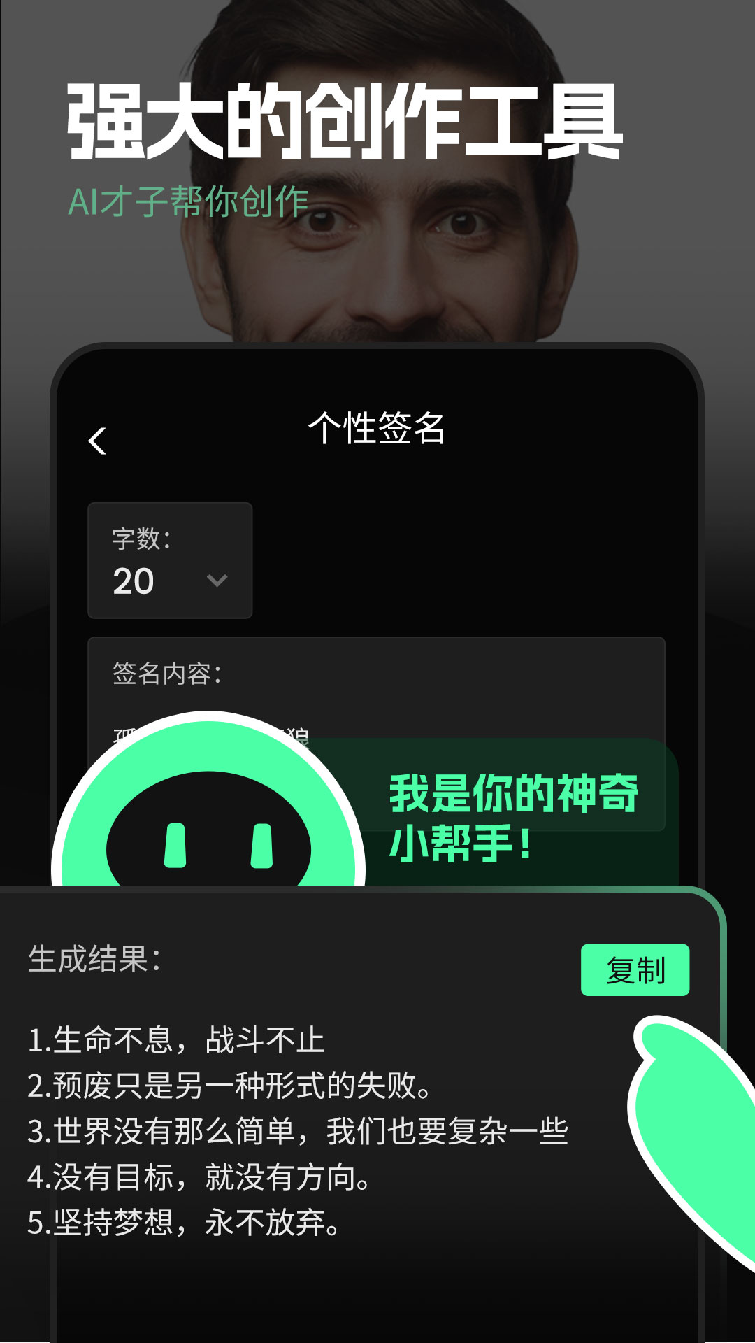 * 创意:诗歌、头脑风暴、朋友圈文案、个性签名等