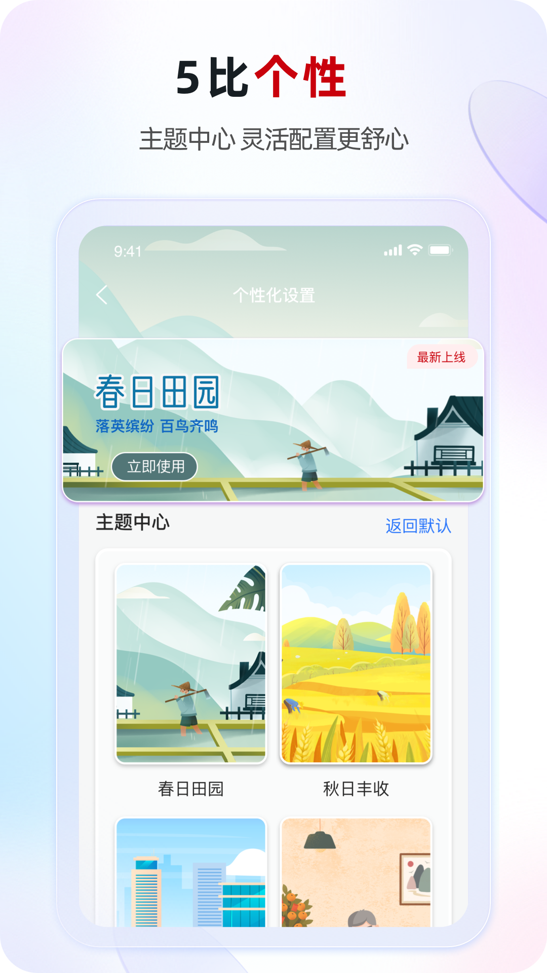 【新主题】丰富多样的主题皮肤、自由灵活的应用编辑以及可定制的菜单,全方位满足您的个性化需求,让您拥有无比个性的体验。