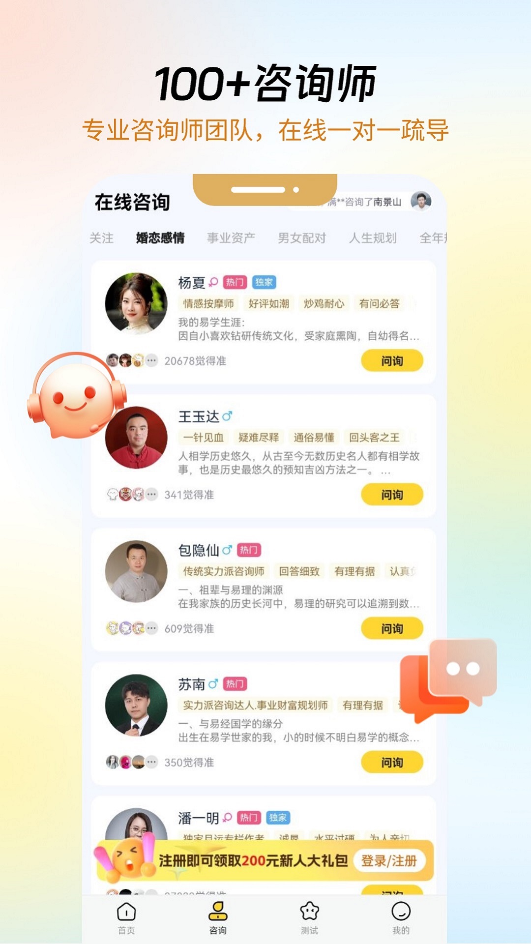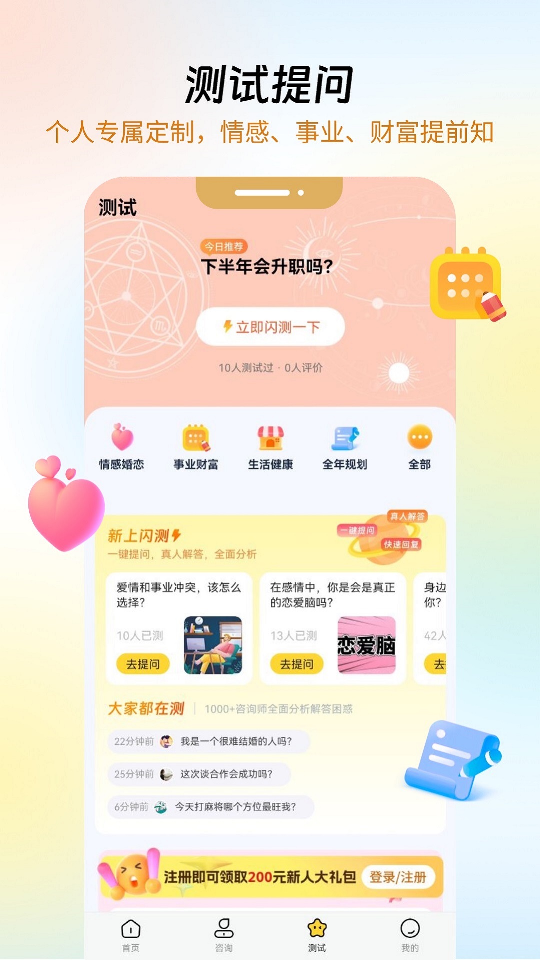 闪测功能,无需等待与预约,即刻倾诉,即时疏通。我们精心准备了海量热门咨询题库,涵盖您可能关心的方方面面。无论是关于婚姻、爱情、职业还是潜能发掘的问题,
