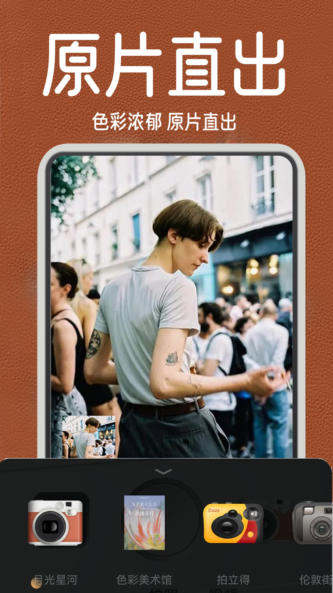 【相机皮肤】不同主题的胶卷滤镜会以不同的相机皮肤呈现出来,拟物化的取景框能够让你仿佛置身于复古胶片拍摄的世界,带来沉浸式的拍摄体验。