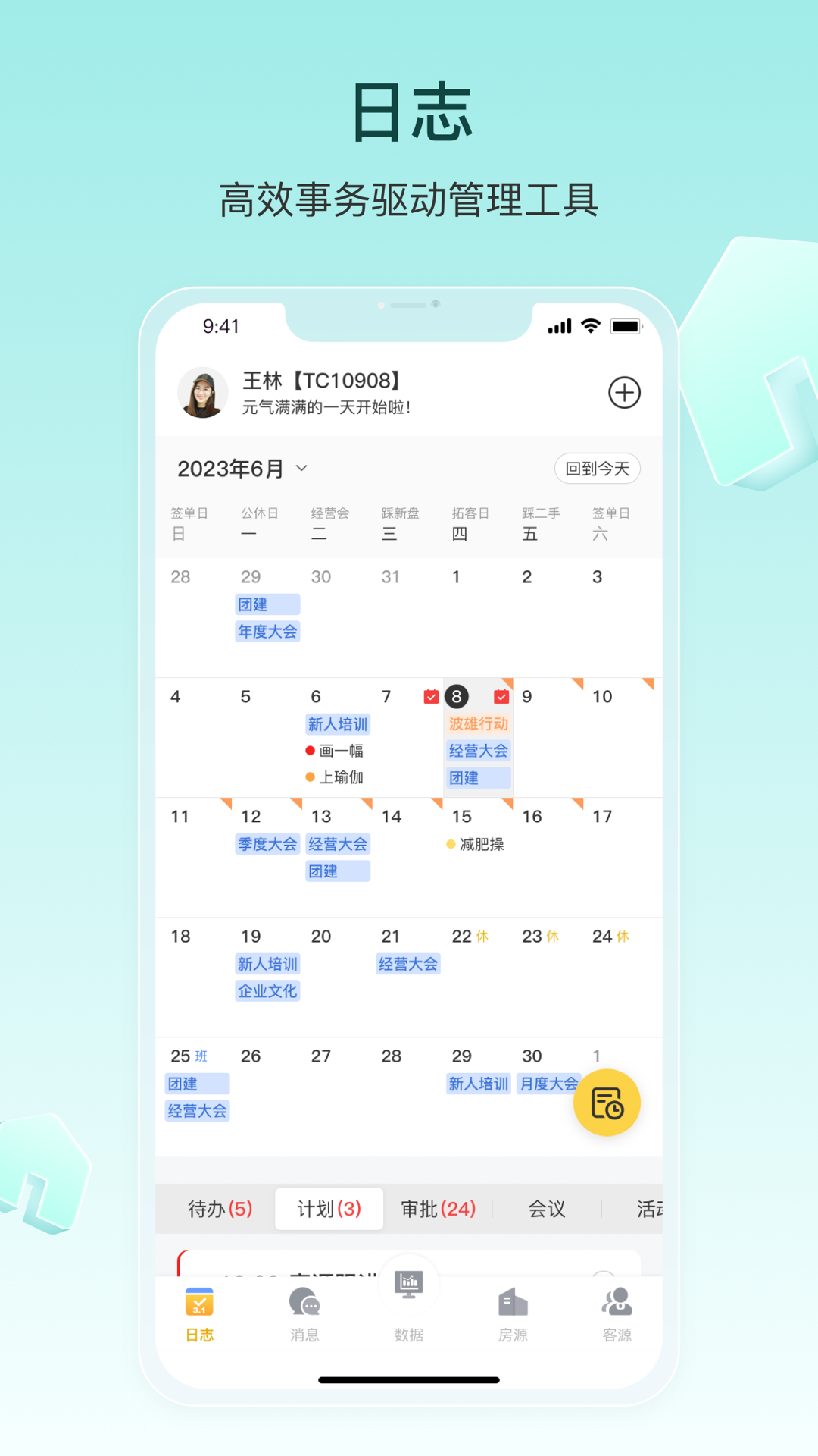 基础功能有供职能人员或经纪人用户进行待办日程及日志管理,核心功能为供经纪人进行房源成交业,如录入房源,检索房源,带看,成交,售后等