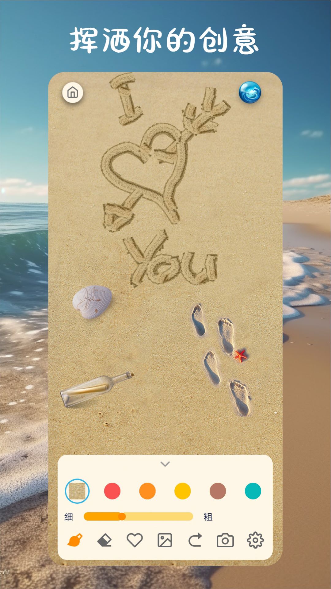 你想描绘出属于自己的独特沙滩吗?想体验浪花一下下冲刷的那种奇妙快感吗?快来试试我们的沙滩涂鸦app吧,它会带给你别具一格的艺术体验哦。