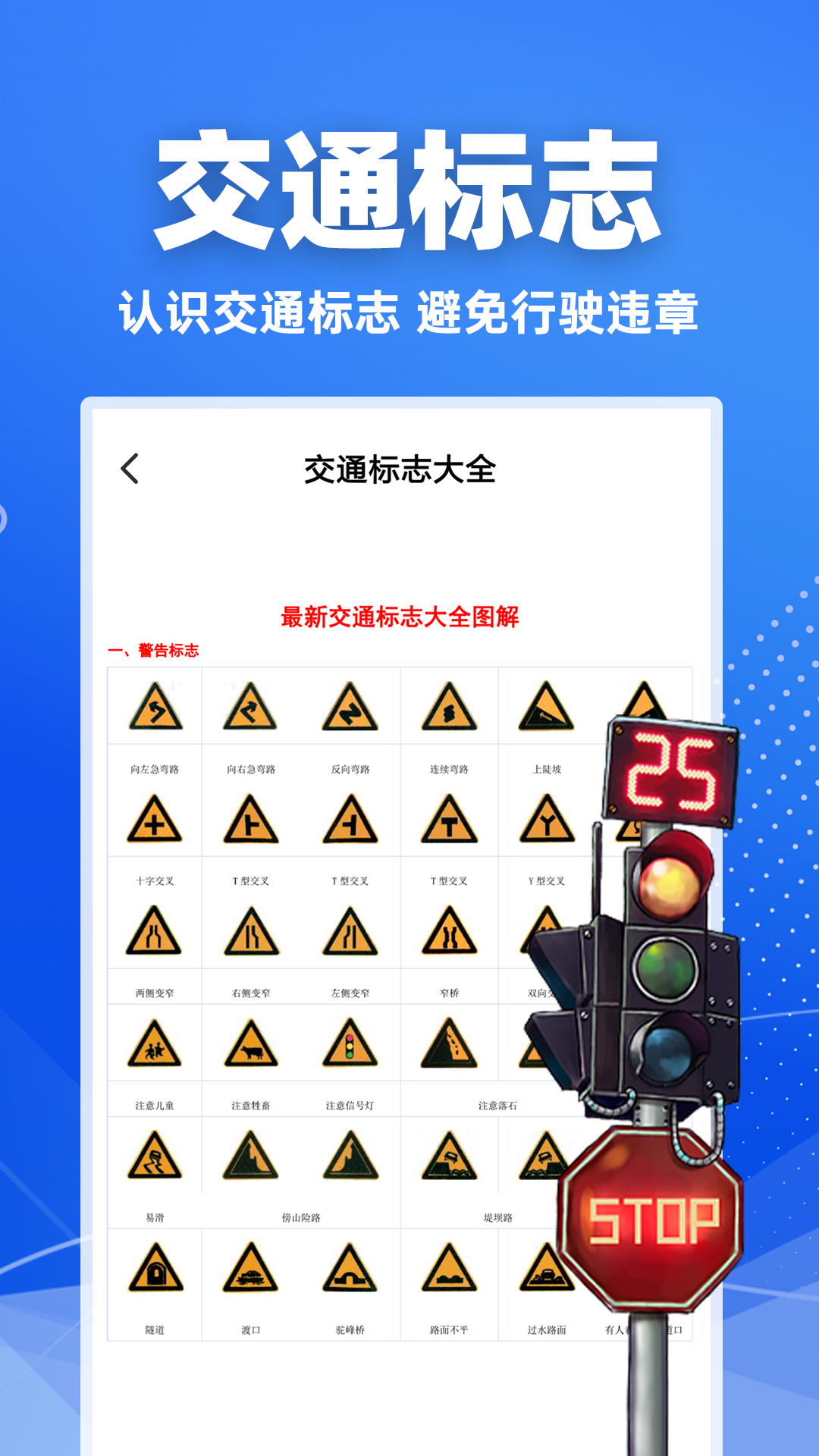 提供各类交通标志的详细解读,包括禁令标志、警告标志、指示标志等。