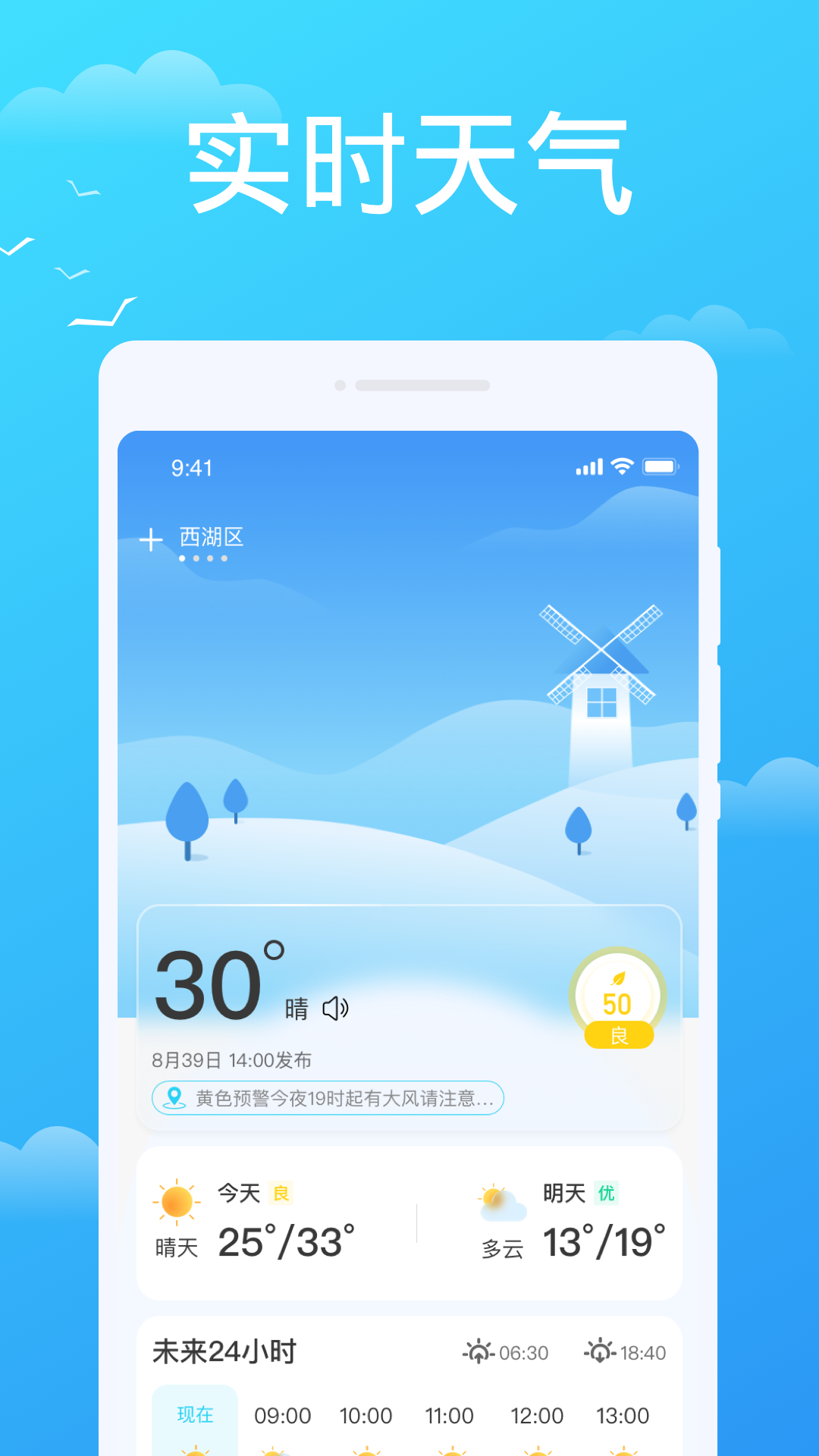 天气预报,支持天气预报查询,实现逐小时的天气预报。同时,还能查询15日天气预报,5日空气质量预报。为方便操作,用户还可以设置桌面天气预报,打开手机即可轻松查看天气预报。如遇异常天气,天气预报会提前预警。懒人天气预报内,富有特色的语音播报天气预报功能,解放用户的眼睛,轻轻一点,即可语音听天气预报,