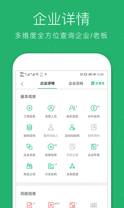 企业查询宝是一款可以快速查询企业信息的强大企业查询工具。覆盖全国1.6亿+企业信息,为用户提供全面有效的企业大数据查询。只要输入需要检索的企业名或人名,就可快速查到企业的工商信息、联系方式、股东高管、股权结构、对外投资、商标专利、司法诉讼、关系图谱、发票查询、变更状况、招聘信息、行政处罚等维度信息。