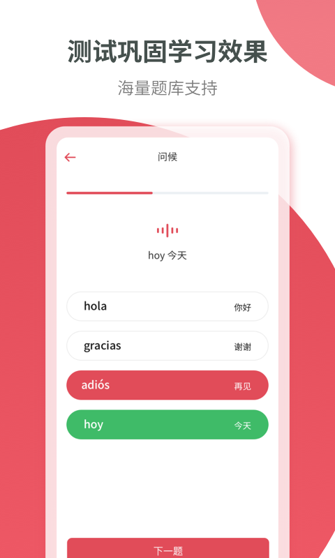 这是一款助力西班牙语零基础入门学习的好帮手!能让你快速开启西语学习之旅。它涵盖西语音标学习,西语单词音标发音教学,是一款专注于西语学习的软件。软件采用全真人发音配音,为你提供优质的西语学习体验。无论是日常西语口语还是基础西语口语,都能让你快速掌握。这里还有功能超强的西语助手,配备丰富的西语题库,让背西语单词变得轻松容易。