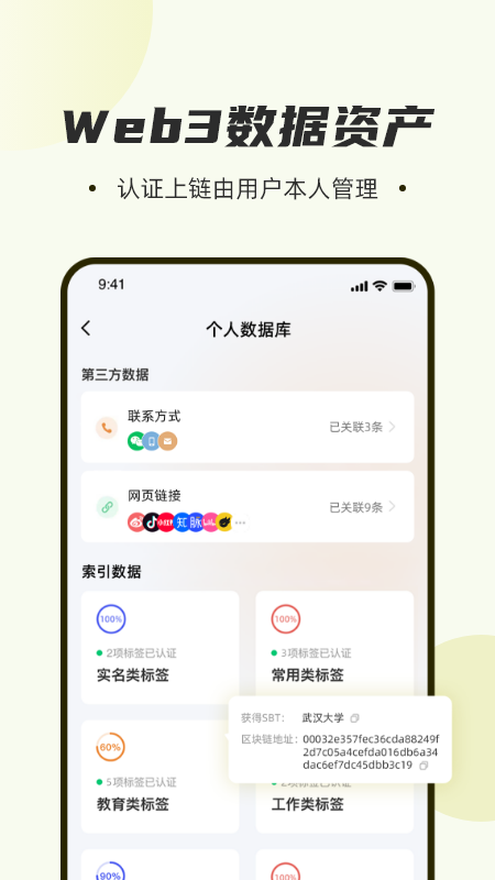 在如尔App里,你能够上传各类数据并且进行认证,从而构建起属于自己的个人数据库。之后,还可以依据需求把数据授权给不同的身份,运用到各种各样的社交场景当中。