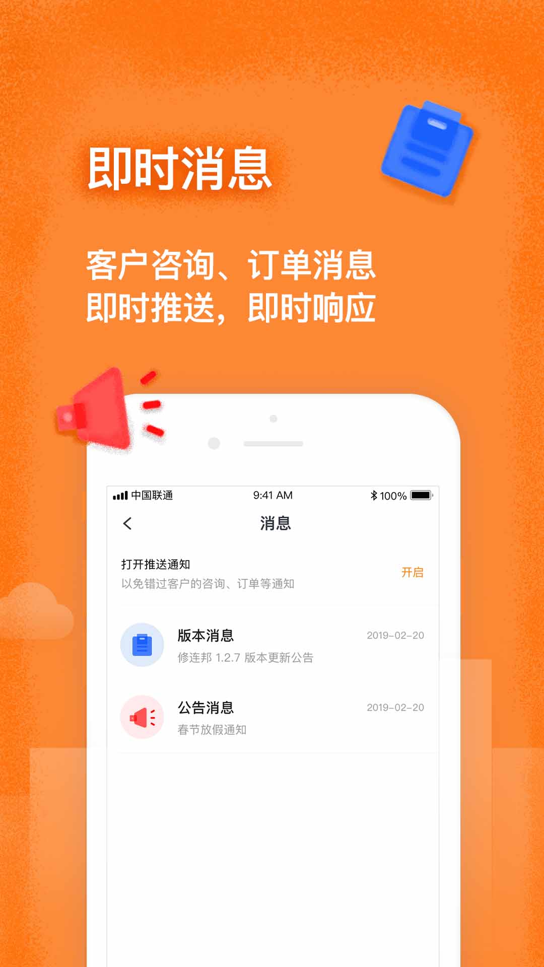 【即时消息】针对客户咨询、订单消息即时推送,便于即时响应;