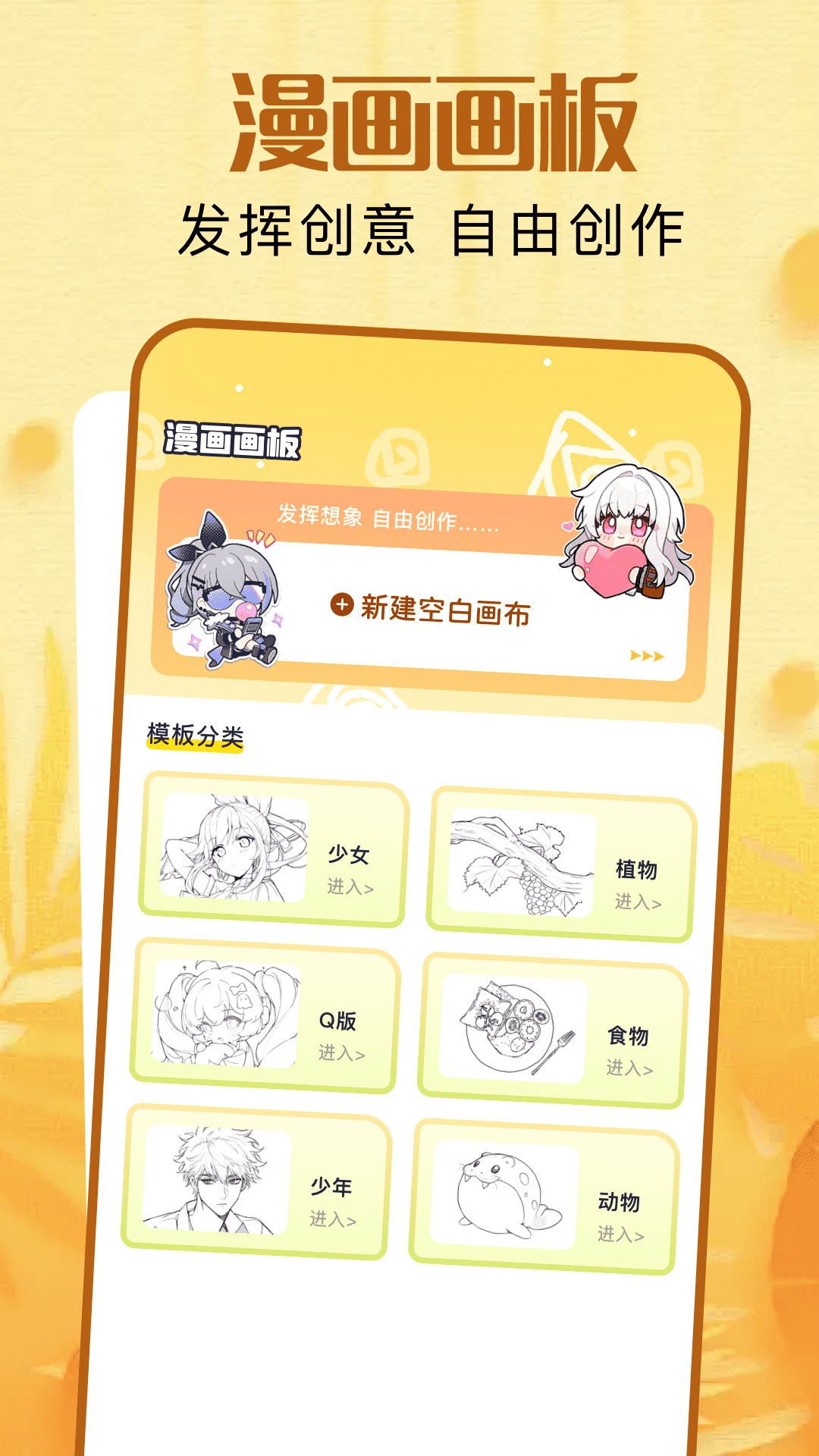 在熊猫绘画里,用户可以尽情发挥创意自由创作。它提供新建空白画布的功能选项,还设有多种模板分类,例如少女、植物、Q版、食物、少年、动物等模板分类,这些都能够满足用户不同的创作需求。