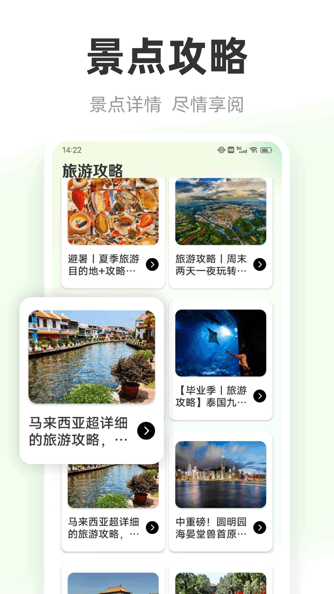 我们拥有涵盖世界各地旅游景点的丰富攻略哦。不仅如此,我们还会为您的旅行精心进行详细规划。您可以自主选择出行时间、旅行目的地,我们能帮您设置行程提醒,告知您旅行需要准备的事项。当您身处心仪的旅游胜地之时,您能够记录下当下的感受,让这一美妙的片段成为您人生中一份珍贵的记忆留存下来。