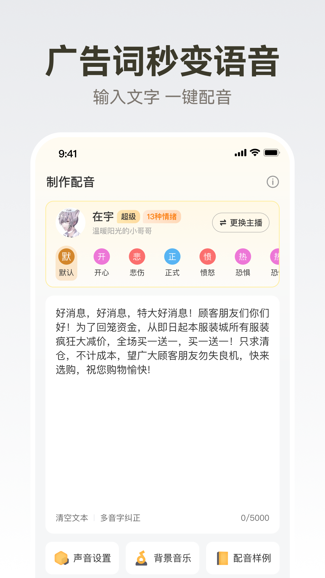 键生成广告叫卖音频。我们有男生、女生、方言、外语等多种音