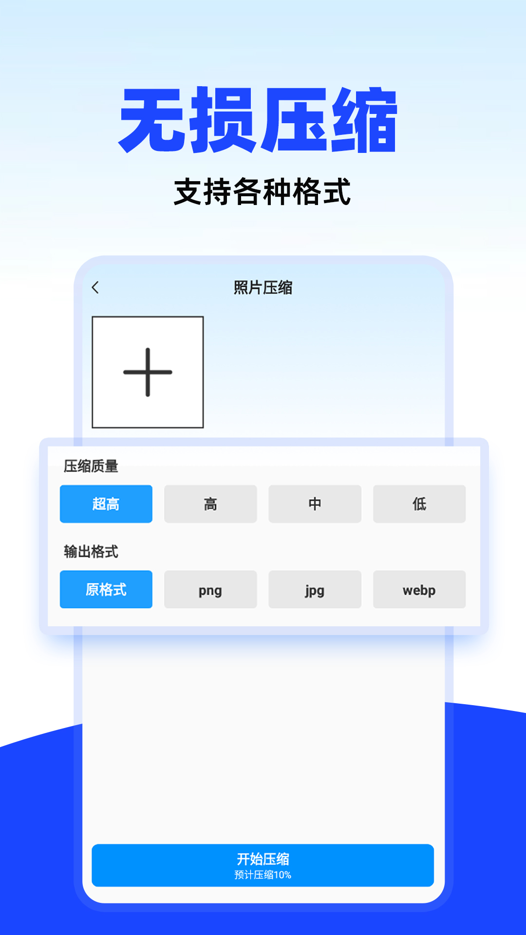 万能照片压缩是一款集高效照片压缩与灵活格式转换于一体的全能型软件,让你的照片处理变得轻松简单,一键解决照片存储和分享问题。