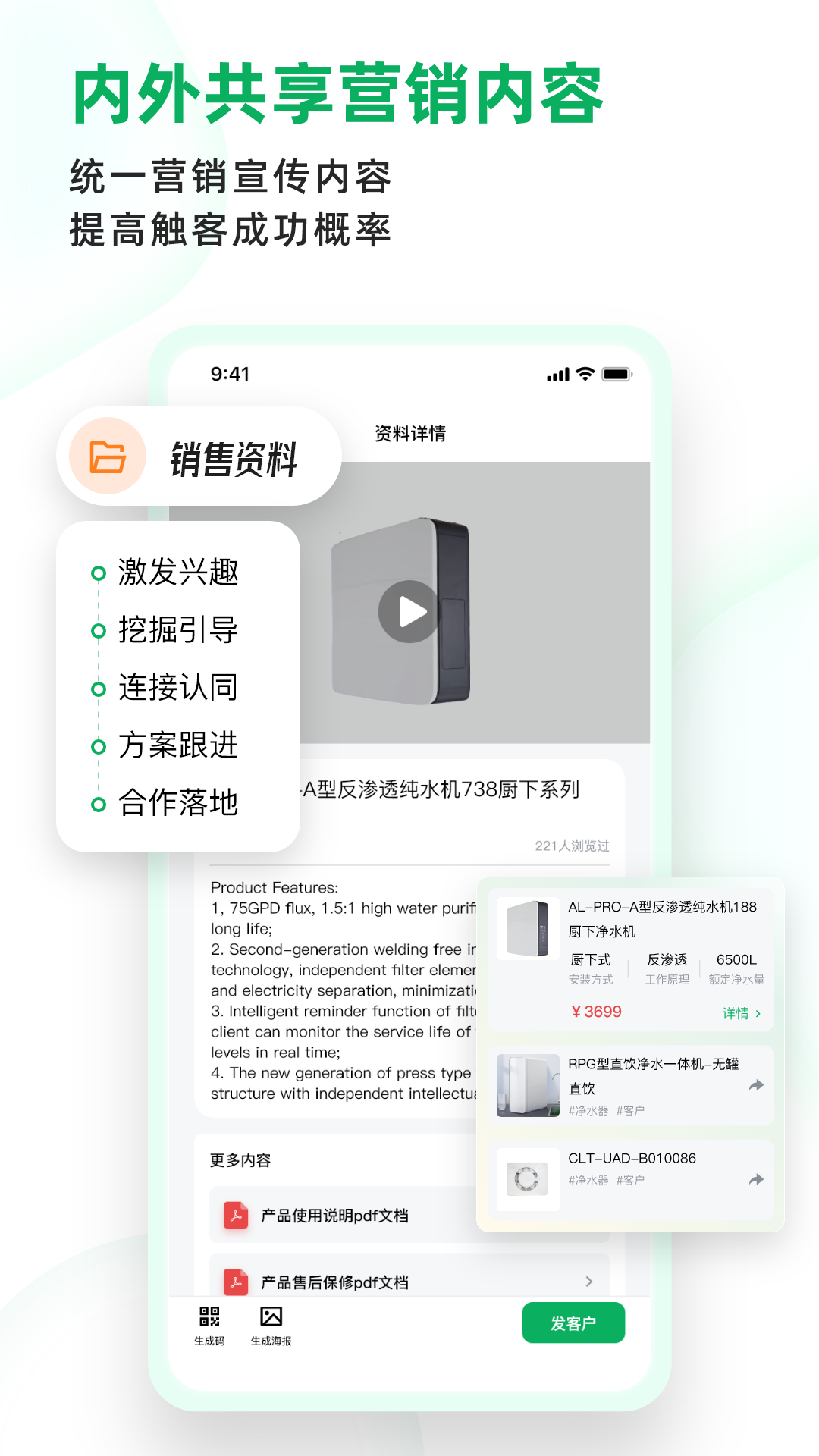 一方面,在营销内容管理与团队协作方面,拥多多能够实现营销内容、资料话术的共享,让企业内部与外部合作伙伴可以共享统一的营销宣传内容,这种共享机制大大提高了营销人员触达客户成功的概率。同时,它还能有效增强营销协作,使得企业内部与外部合作伙伴之间的营销合作更为紧密高效。