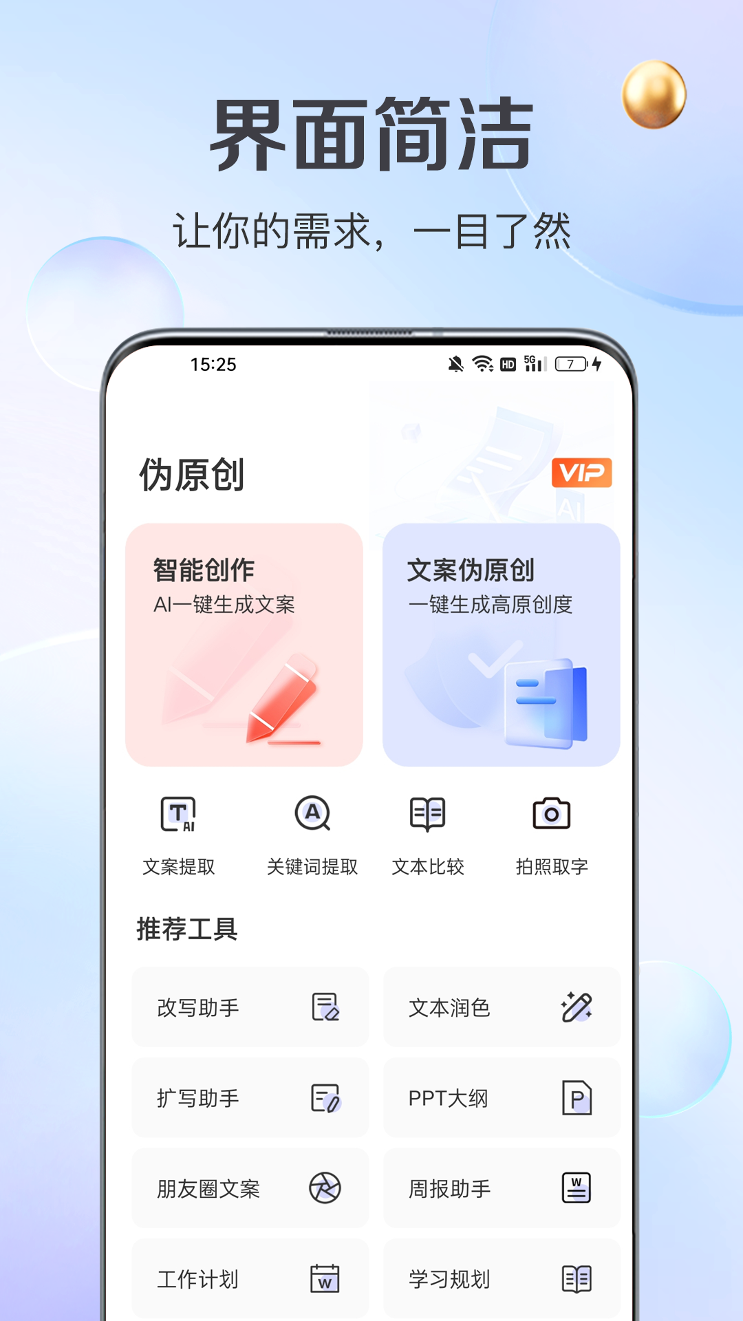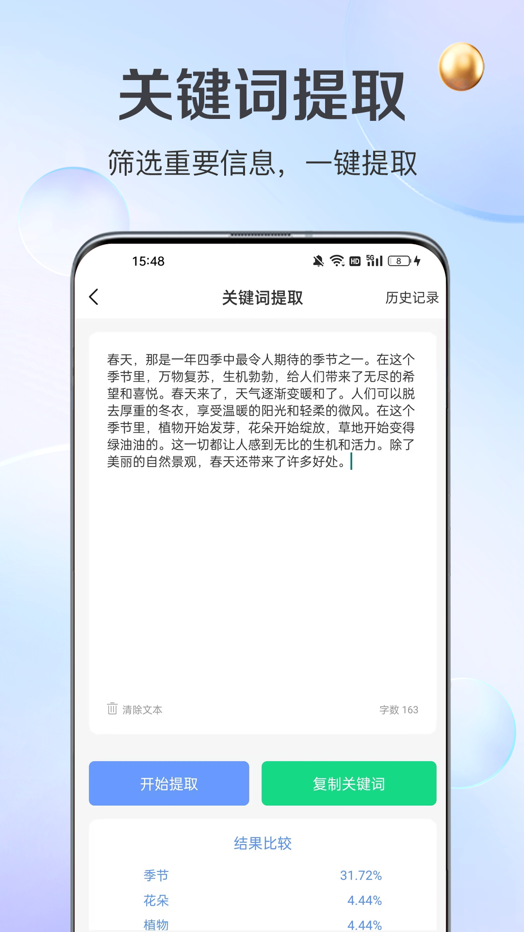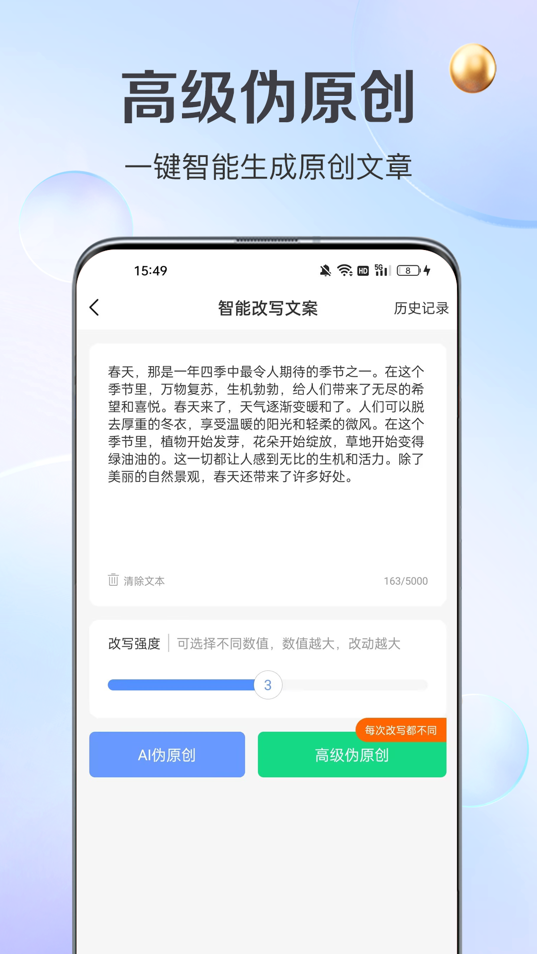 伪原创是一款极易上手且非常实用的写作软件。它具备诸多实用功能,其中文案一键生成伪原创功能十分便捷,只需输入文案或者长按粘贴文案,软件就能依据文案重新改写,智能生成原创文章。此外,它还自带文案提取功能,无论是短视频、本地音视频还是文本文件,均支持多种格式,可一键提取文案。还有关键词提取功能,能进行新媒体关键词挖掘,从而让你的内容精准地把握流量密码。其文本比较功能也不容小觑,可将原文与另外一段文字进行对比,清晰地将不同之处标记出来,使对比结果一目了然。另外,软件还具备拍照取字功能,并且支持对内容进行复制、编辑操作。