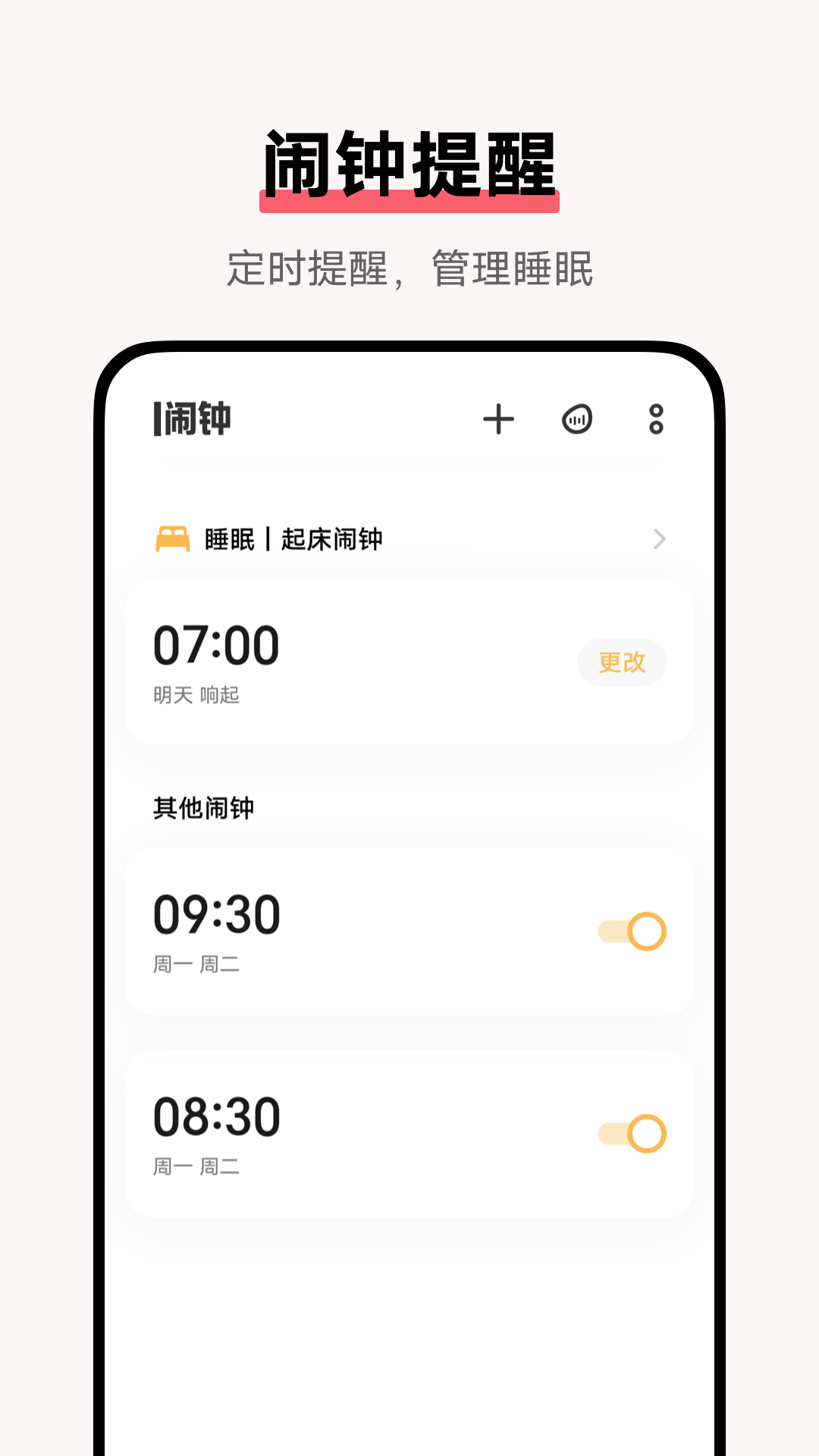 【闹钟】支持设置定时闹钟、管理睡眠周期,内置多种个性化闹铃供您选择;