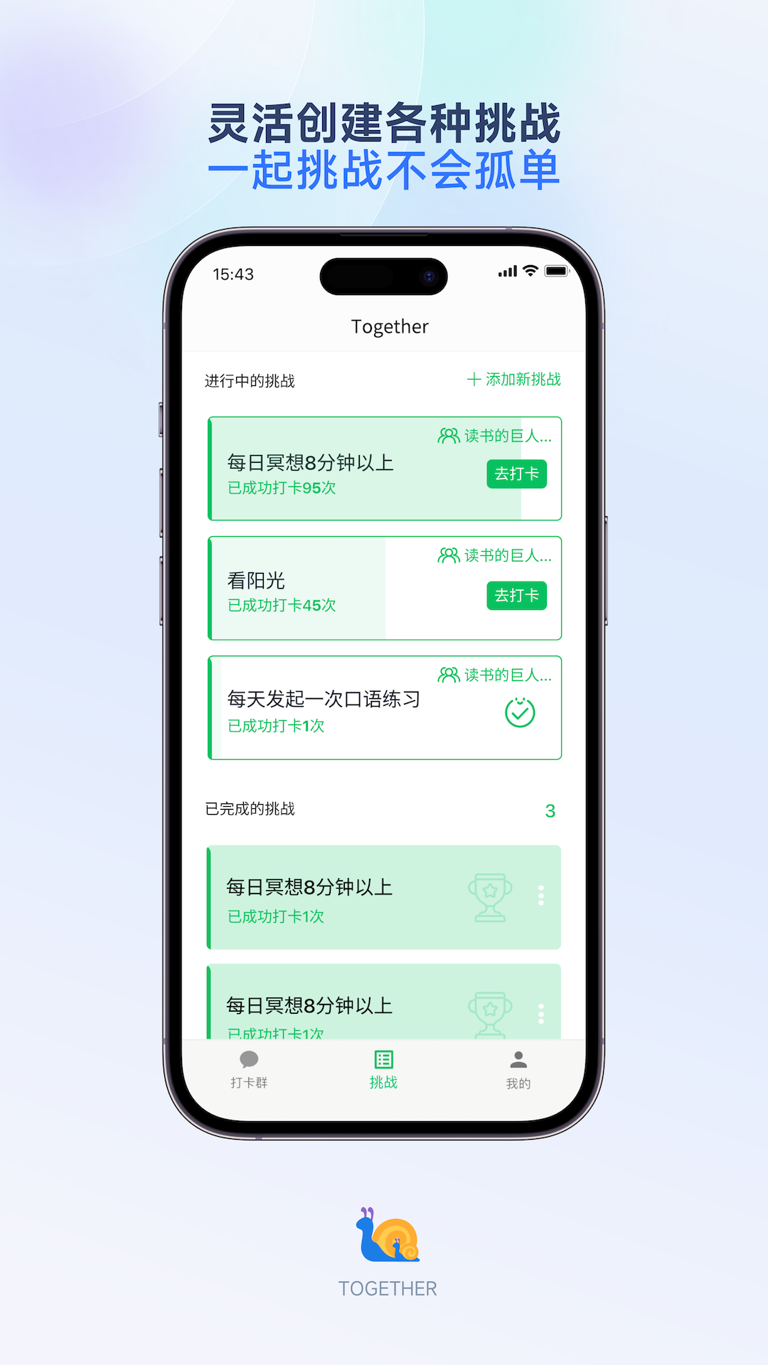 • 挑战创建与加入:在Together里能够轻松创建新的挑战,这有助于让坚持逐步成为一种习惯。