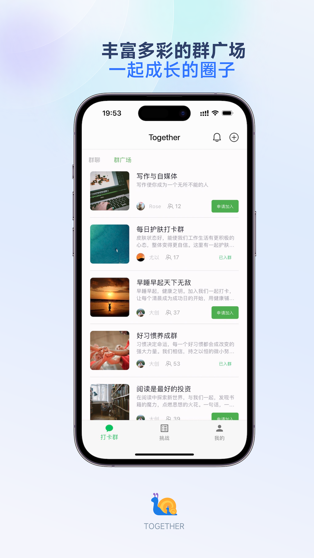 欢迎来到Together,这是一款群体打卡App,专为那些心怀目标、期望与他人共同成长的用户打造。不管你想要坚持的是每日阅读,还是保持健身,亦或是其他任何习惯,Together都会是你绝佳的伙伴。