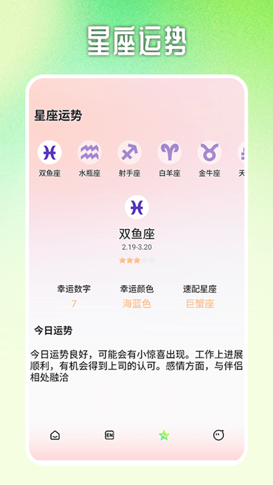 此外,还能进行每日星座运势查询,更多精彩的内容等您来体验哦。