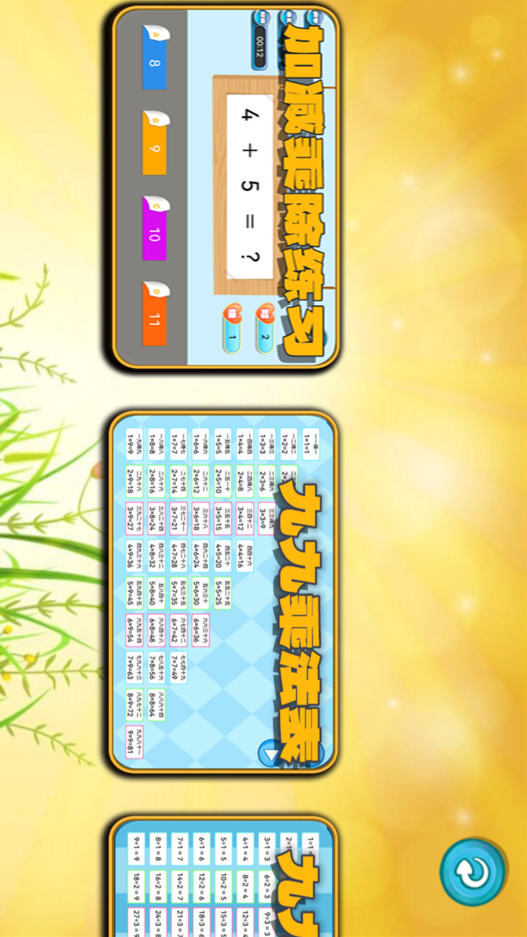 软件还支持九九乘法表、除法表、加法表、减法表的点读和自动朗读,方便随时进行学习与背诵,是宝宝学习加法,减法,乘法,除法的得力助手。