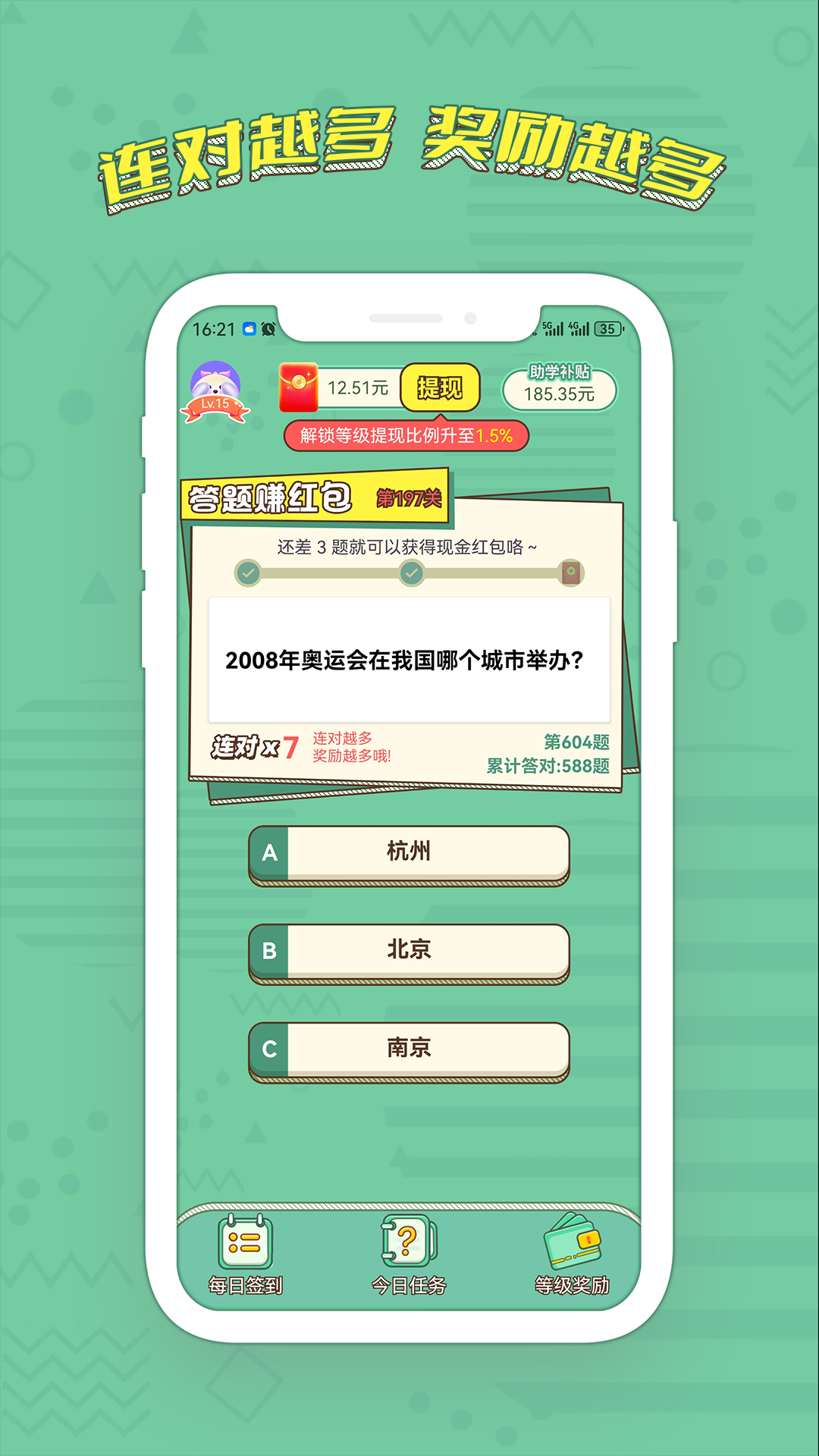 这款应用是一个益智类的答题竞技游戏,拥有多种模式,像知识问答、成语挑战、诗词考验以及歇后语比拼等。