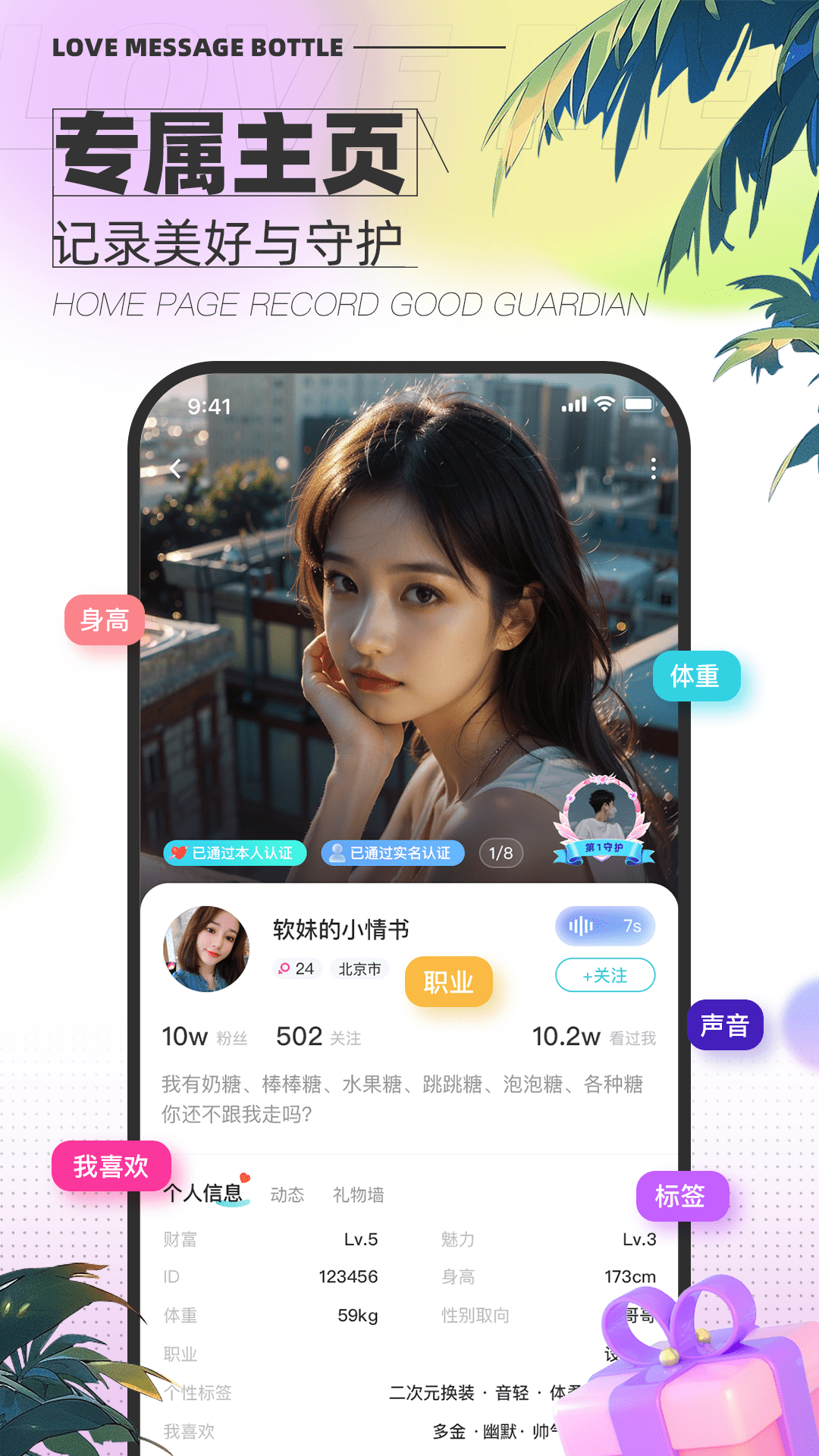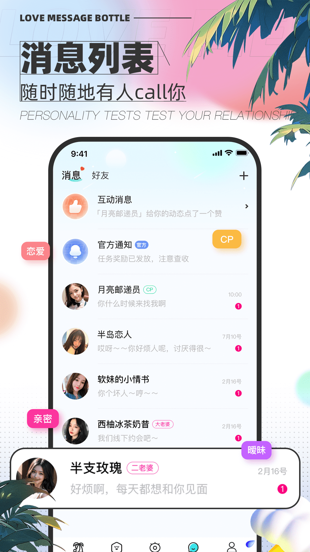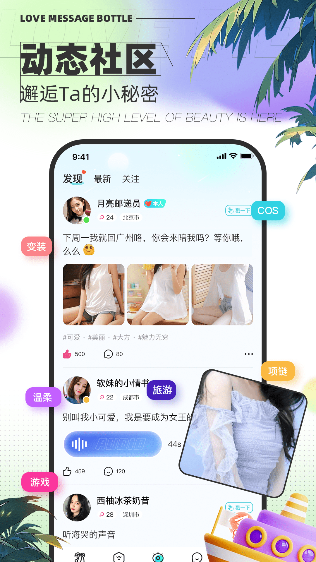 丰富而完善的甜蜜标签,再加上实时活跃及同城的列表功能,使你随时都能更迅速、更精准地找到适合自己的恋人,从此告别孤单。