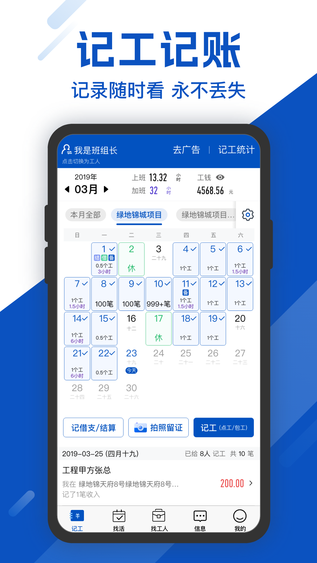 便捷处理建筑工地记工天、记工时、工地记账、建筑工地考勤等建筑办工问题;