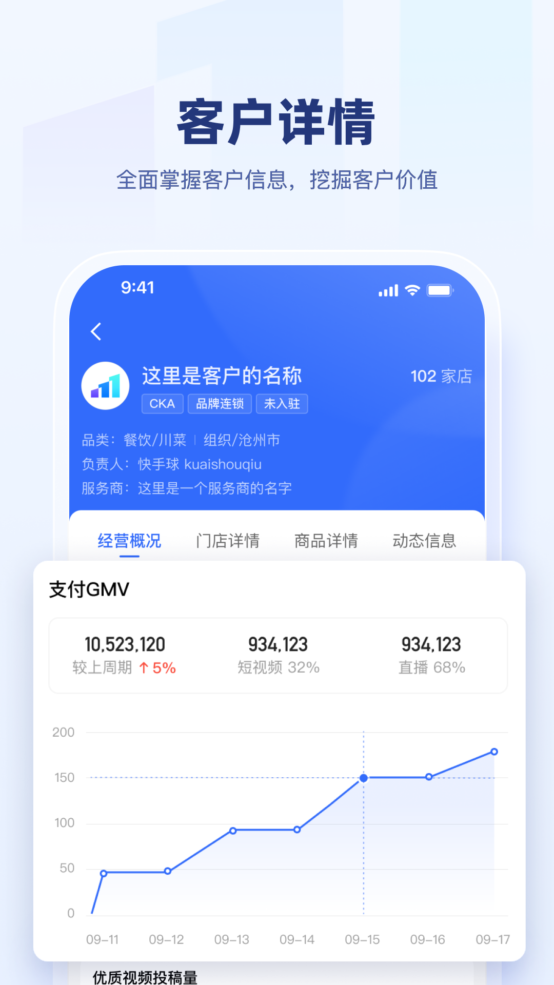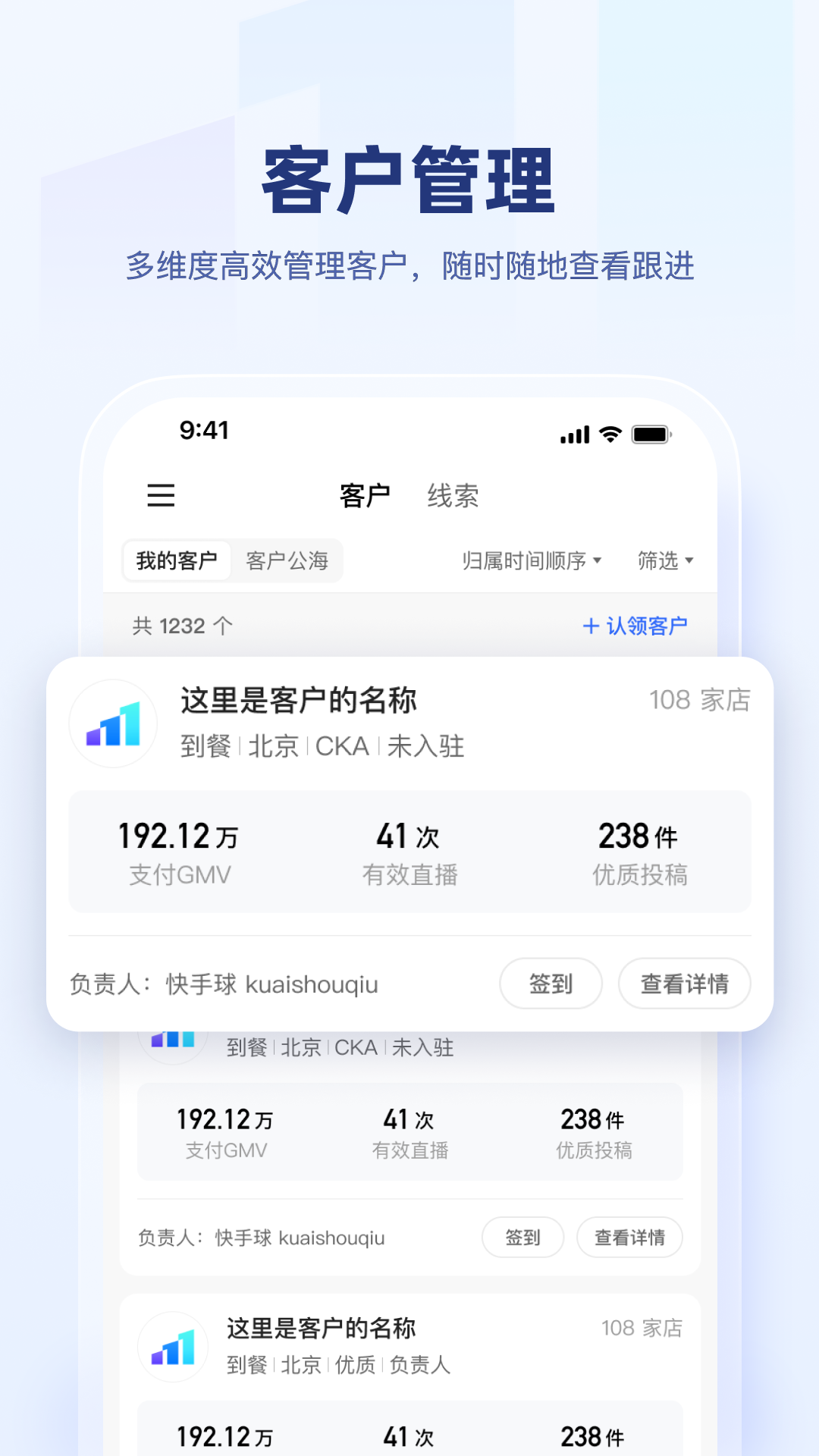 【快手盈客】是快手本地生活官方推出的销售运营管理平台,为销售提供一站式服务和客户全生命周期管理能力,打通客户管理、拜访跟进、经营分析、业绩跟进全流程。赋能业务提效,助力业绩增长