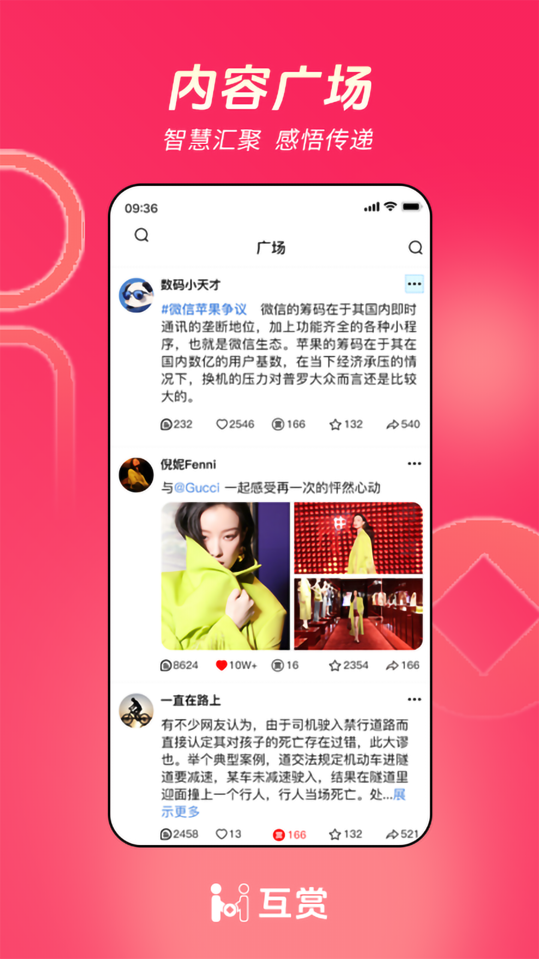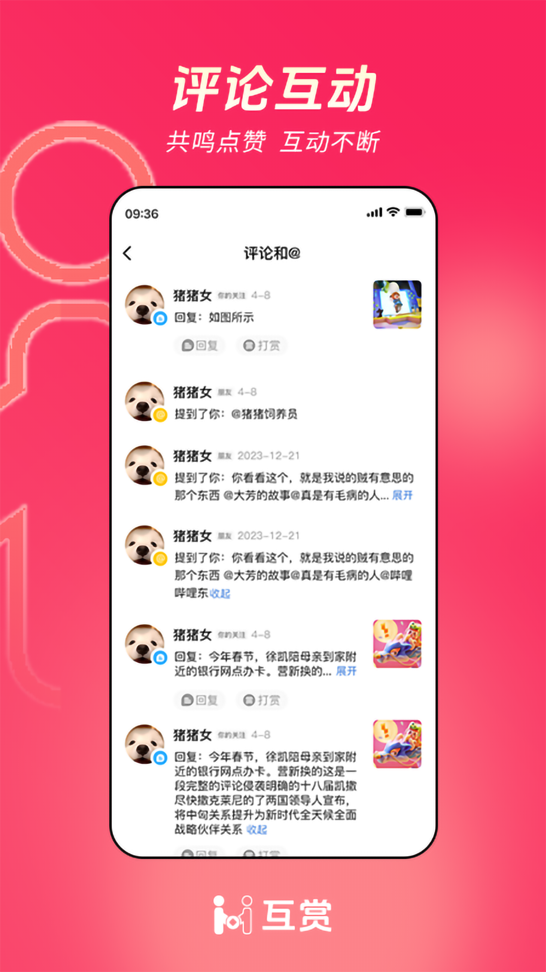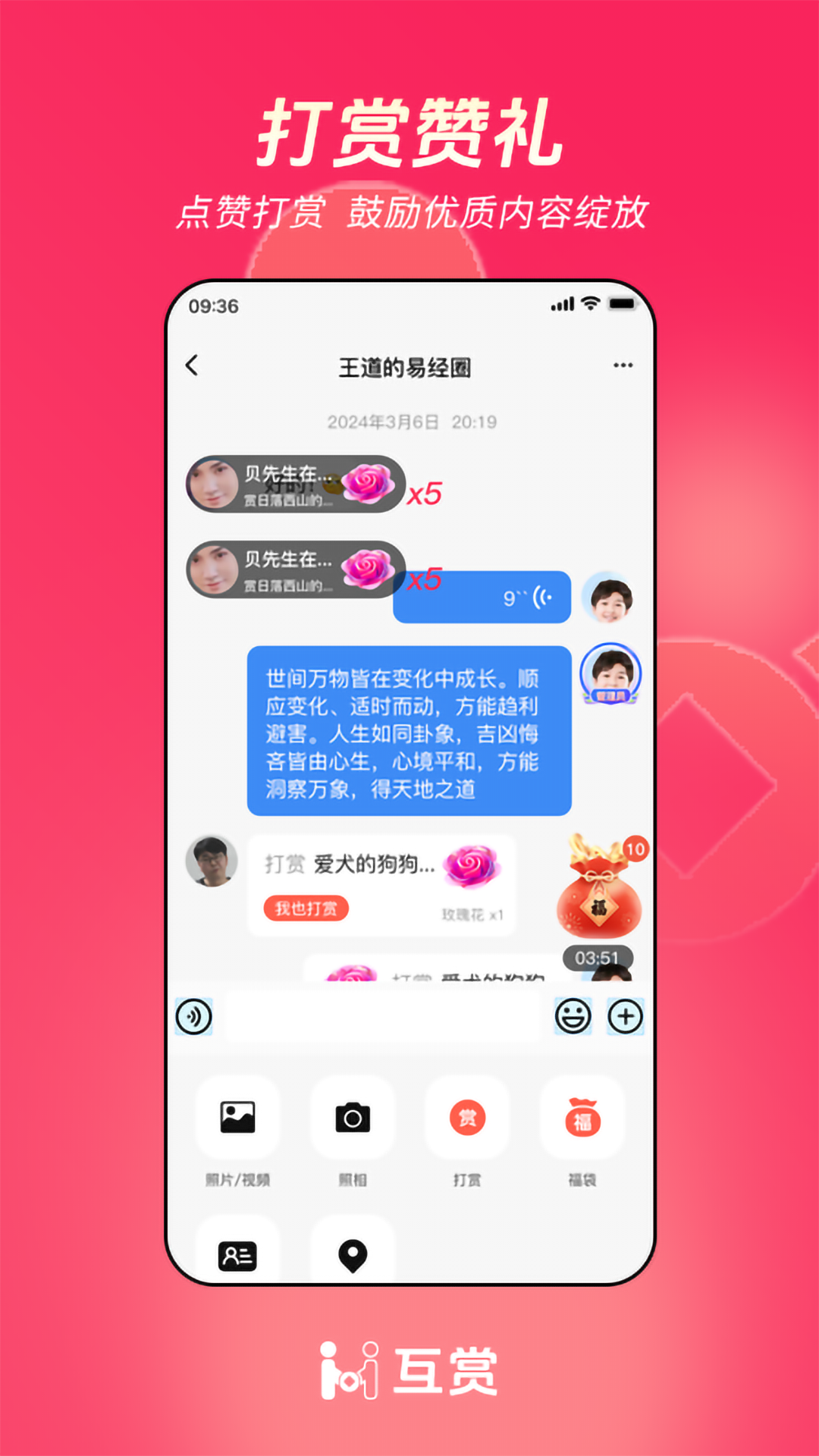 互赏,因价值而闪光;互赏APP是围绕度假休闲综合实体为载体,通过学习、社交、养生项目为内容,实现一个高品质的度假旅游体验,加上APP的平台辅助,打造一款,链接线上喜欢各种主题的旅游人士和各行各业的意见领袖,线下全国各地优质的度假休闲综合体的APP,用利他思维,打造一个共赢的社交平台。