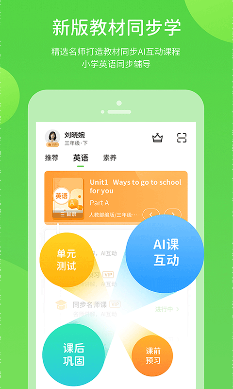 2. 课内同步学:由精选的名师精心打造课内同步的AI互动课程,专门针对小学英语进行同步辅导。
