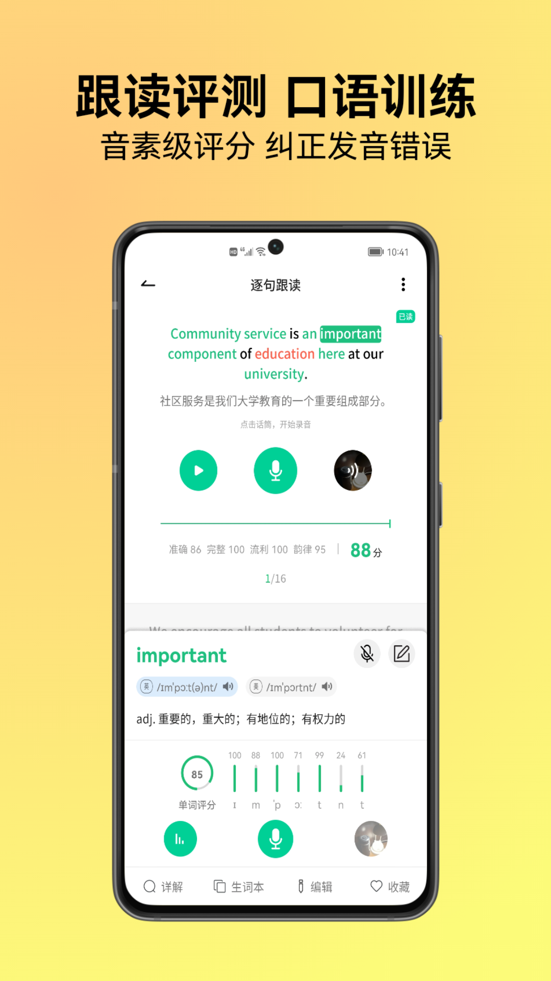 4. 词句跟读:可对单词和句子进行跟读评测,进行音素评分,检测连读弱读情况,有效提升发音和口语能力。