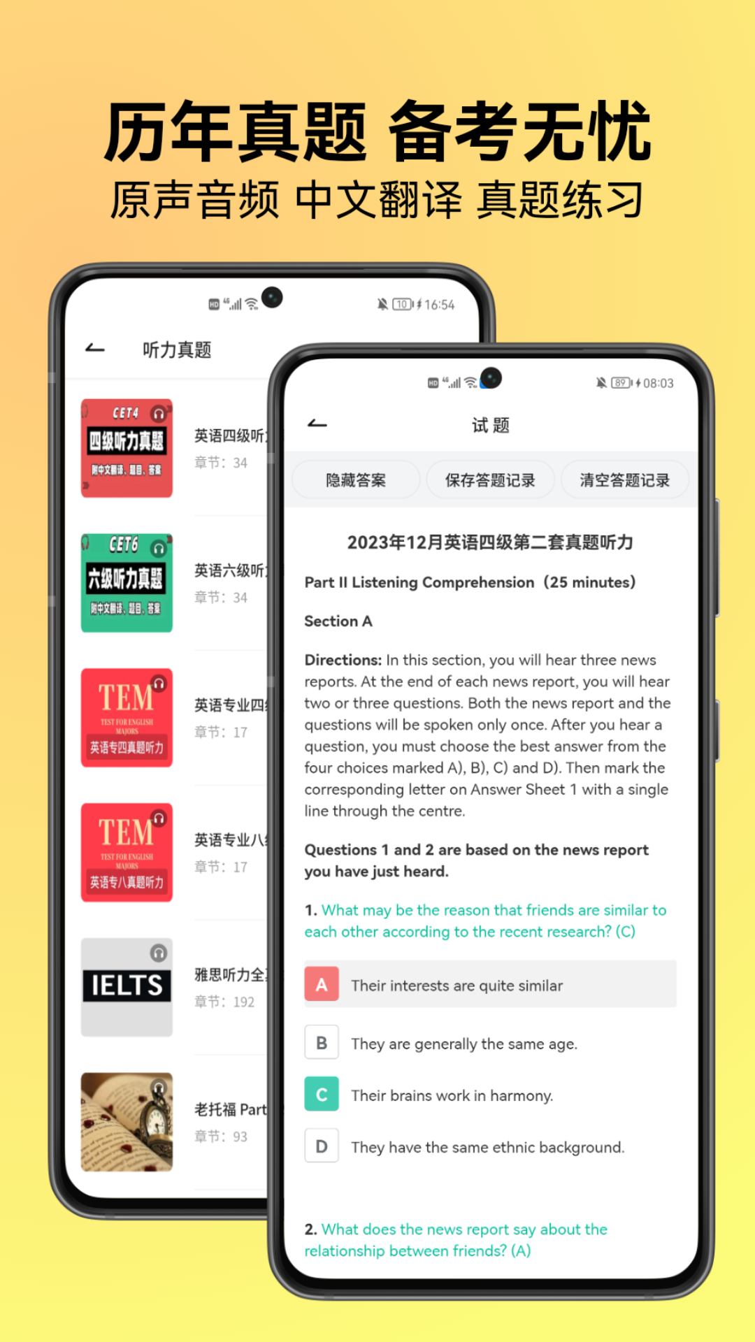 1. 多种考试素材:涵盖初高中、大学四六级、考研、雅思、托福、商务职场等听力材料。