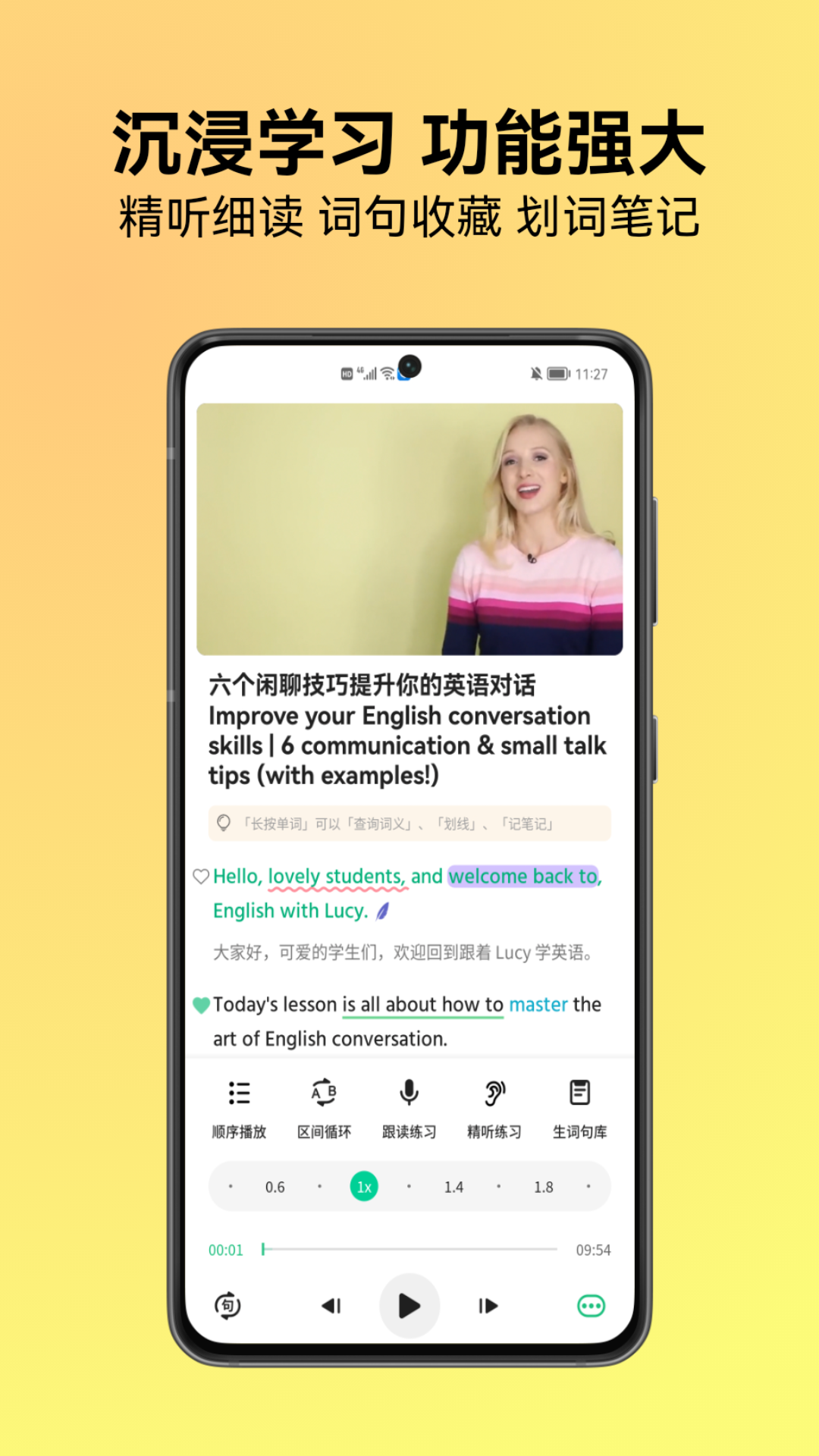 考拉英语为用户提供了大量的听力和视频素材,并且还配备“逐句精听”以及“跟读评测”练习,助力用户达成听得懂、说得出的目标。