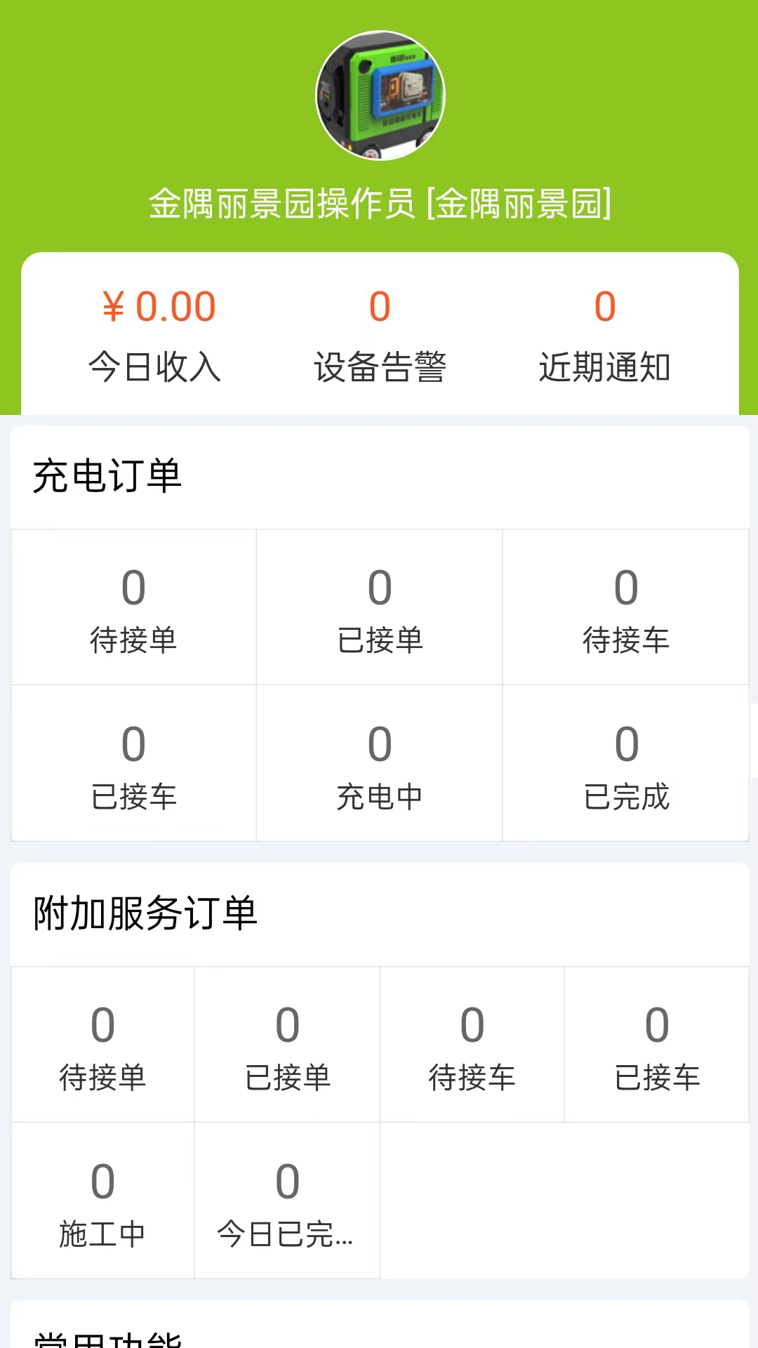 充电订单接单处理;附加服务订单接单处理;车牌查询(查询是否已被会员添加为我的车辆);异常上报;设备告警记录;我的打电车(基本信息、启用状态、在线状态);修改密码;帮助中心(常见问题、联系客服、我的工单);通知公告。