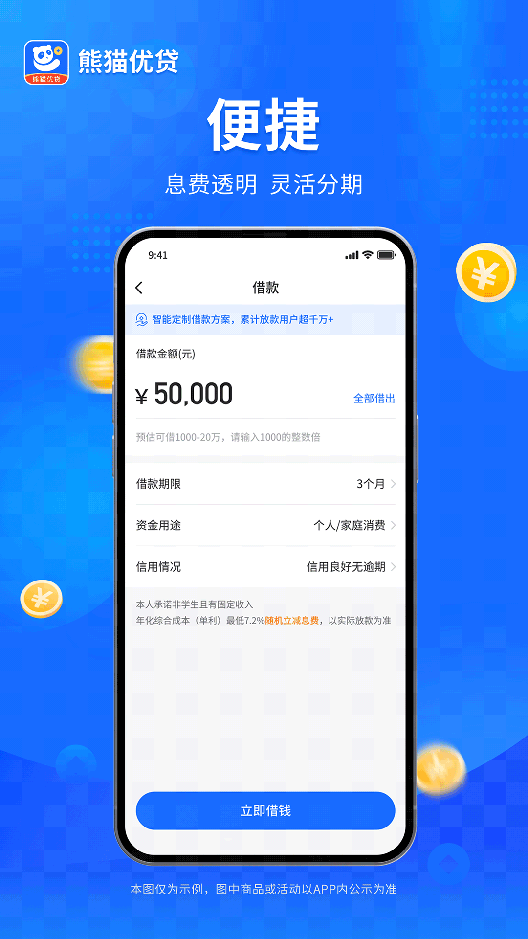 4.快捷:全程线上申请,最快30秒审批,最快3分钟放款!