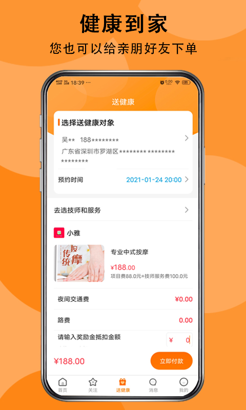 送健康平台是大健康一站式服务上门平台,汇聚上门按摩、推拿、SPA、中医理疗等。连接本地优质商家和技师,为线上用户提供高价值高品质的养生、保健、按摩服务。一键预约,足不出户,健康到家。还可以为亲朋好友和长者或不方便出门的人群提供专业的养生、保健、按摩服务, 随时随地预约附近技师服务上门。