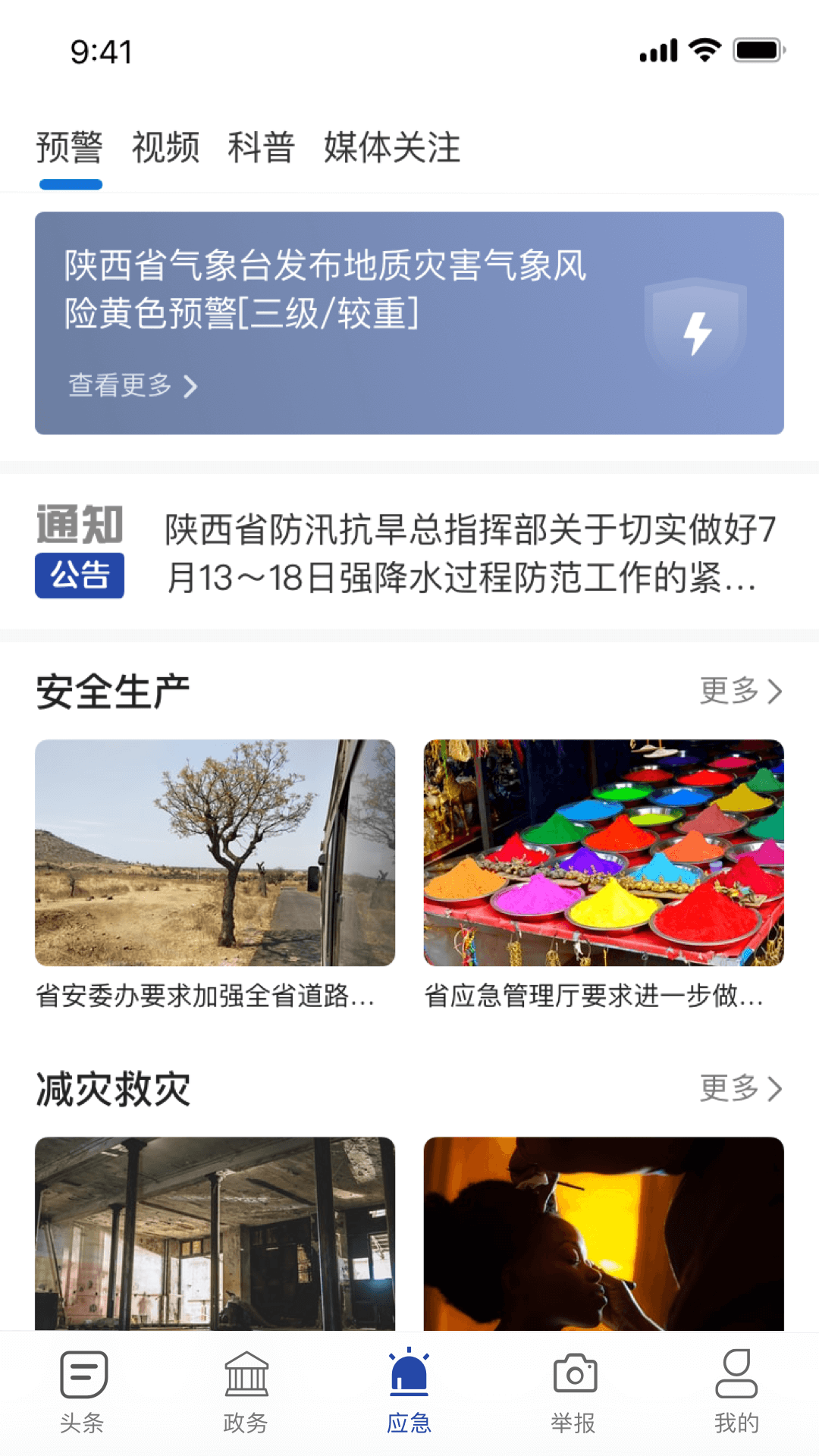 该软件一共设置了头条、政务、应急、互动、我的这5大板块,在这些板块下还设有首页、陕西、本地、专题、科普、公开、预警等10多个子栏目。