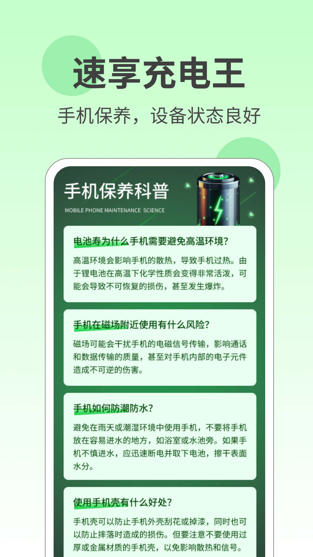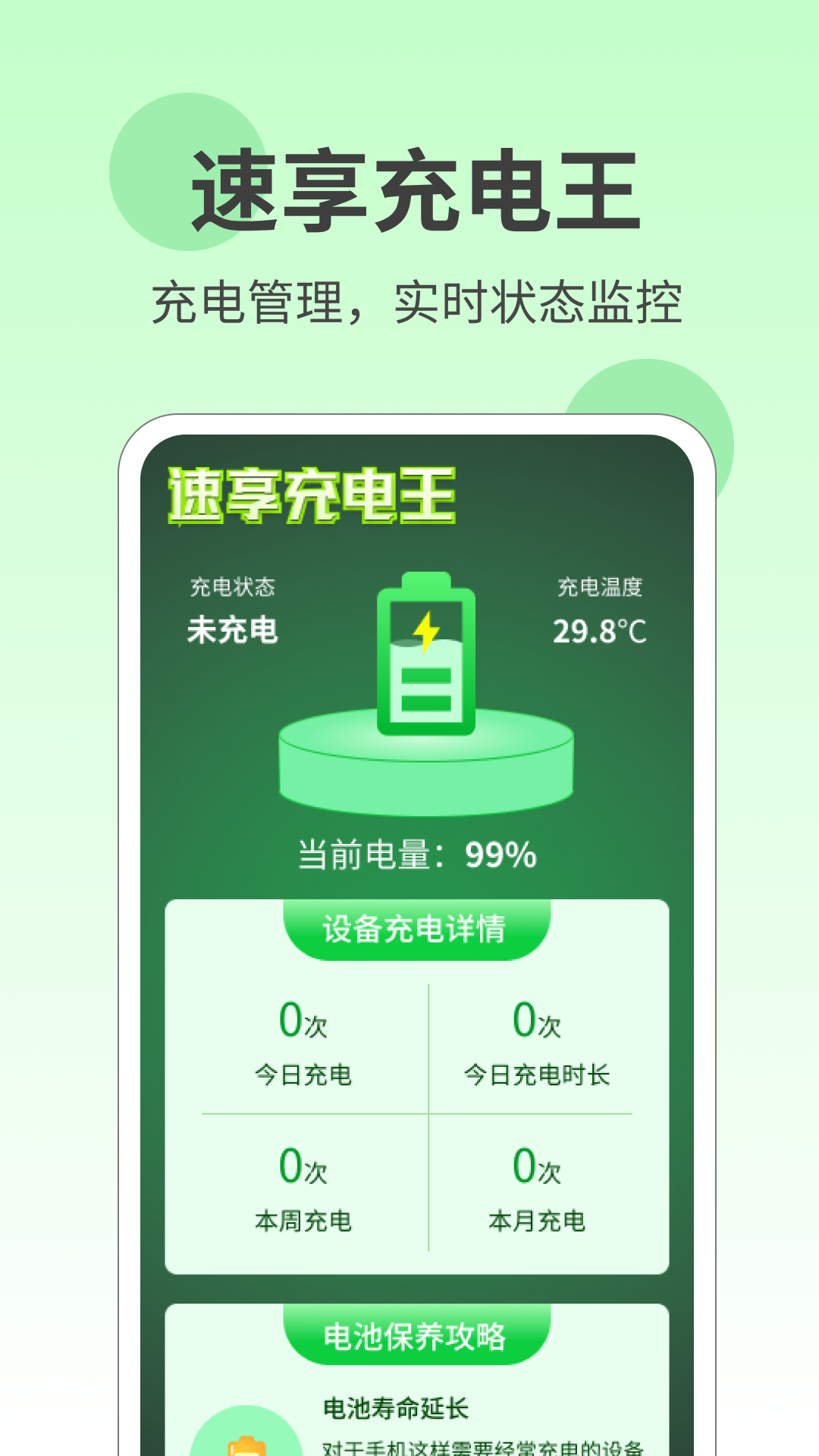 速享充电王是一款功能强大的充电管理应用,提供实时显示当前充电状态、温度、电量等信息,详细记录设备的日常、周度、月度充电详情,同时提供电池寿命保养攻略和手机保养知识科普,让用户更好地保养和管理手机设备,保持设备良好状态。速享充电王旨在为用户提供便捷、实用的充电管理服务,让用户的手机始终保持最佳状态。