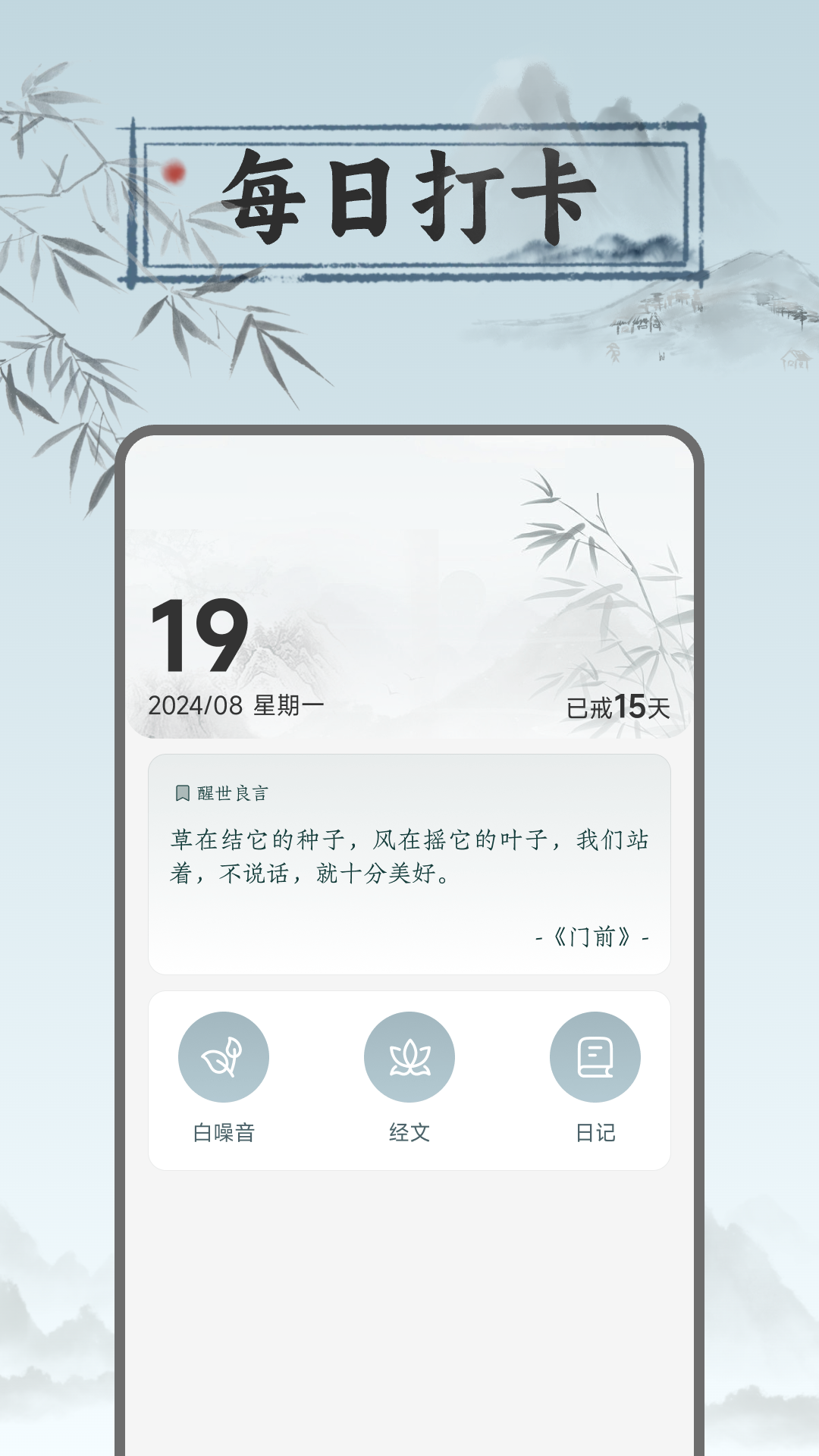 戒色打卡是一款专为追求精神净化与自我提升的用户设计的戒色打卡应用。我们相信,通过持续的自我监督与正面激励,每个人都能实现更健康、更和谐的生活方式。我们不仅提供戒色打卡功能,还融入了纯音乐、冥想助眠音和白噪音等元素,帮助用户在戒色的同时,享受心灵的宁静与放松。
