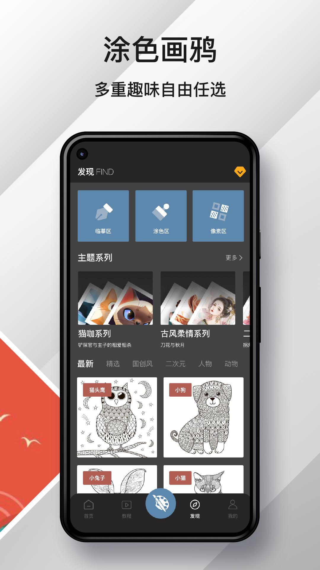 这是一款手机上的画画涂色软件——Medibang paint。当你打开它,就能体验到多种风格各异的古风元素,像是古风图片、人物、饰品、花卉,还有二次元风格等内容。这里的画作会不间断地免费更新,海量精美的图片等待着你去发现。
